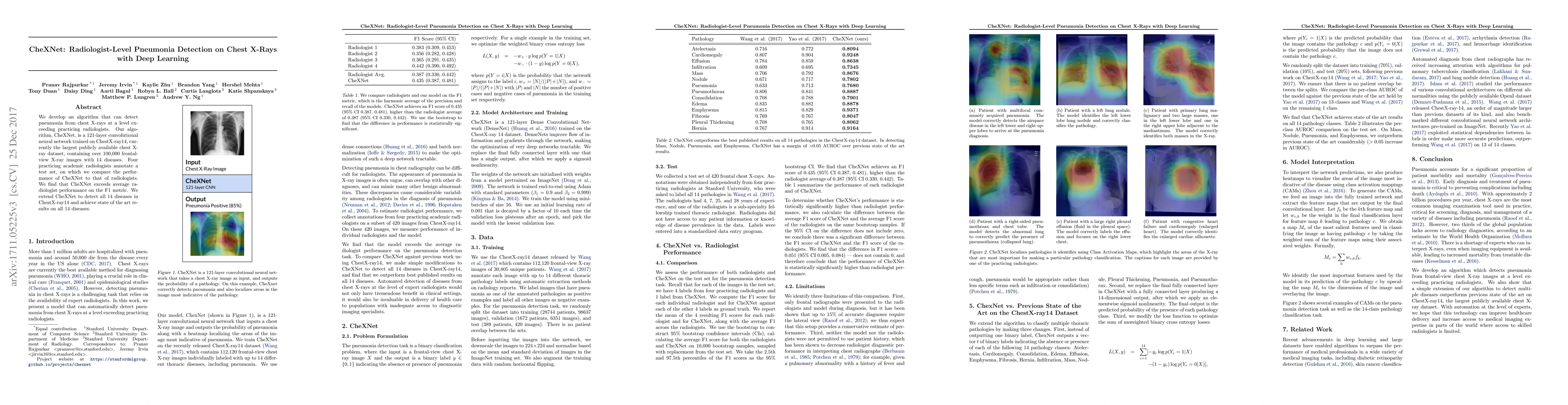 CheXNet, a 121-layer convolutional neural network, surpasses average radiologist performance in detecting pneumonia from chest X-rays, and achieves state-of-the-art results for detecting 14 diseases in the ChestX-ray14 dataset. The algorithm's performance is validated against annotations from practicing radiologists.