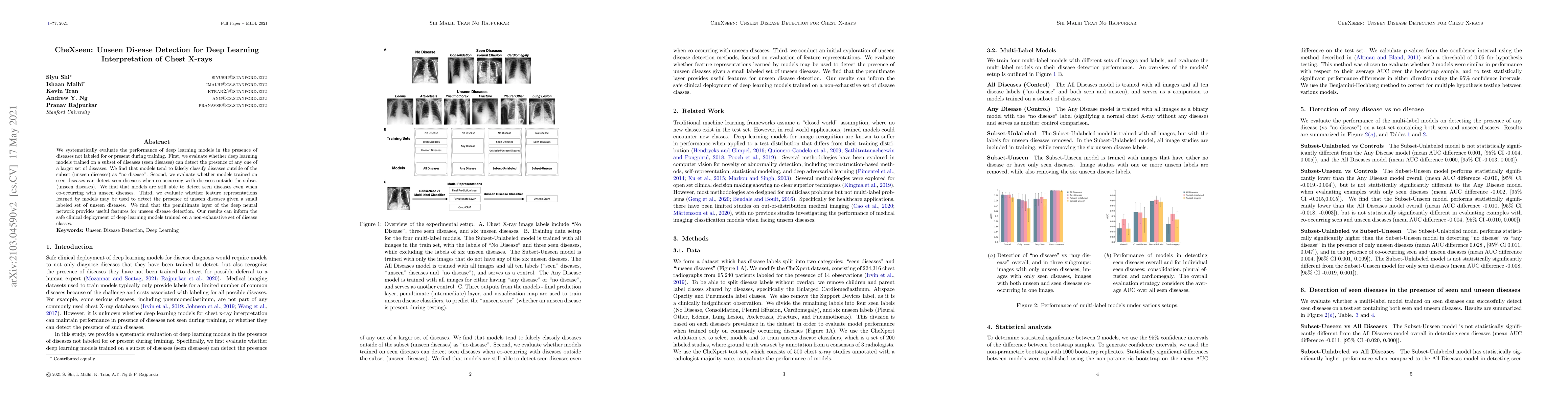 Deep learning models can detect seen diseases even when co-occurring with unseen diseases, but struggle to identify unseen diseases. Using features from the penultimate layer of the network can improve detection of unseen diseases.