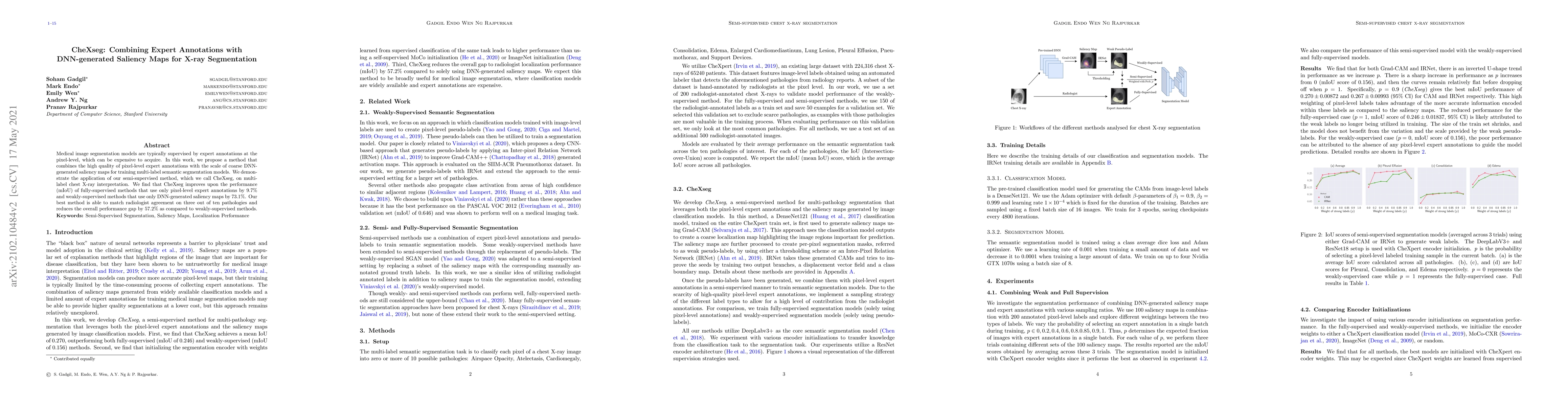 Medical image segmentation models are typically supervised by expert annotations at the pixel-level, which can be expensive to acquire. In this work, we propose a method that combines the high quality of pixel-level expert annotations with the scale of coarse DNN-generated saliency maps for training multi-label semantic segmentation models. We demonstrate the application of our semi-supervised method, which we call CheXseg, on multi-label chest X-ray interpretation. We find that CheXseg improves upon the performance (mIoU) of fully-supervised methods that use only pixel-level expert annotations by 9.7% and weakly-supervised methods that use only DNN-generated saliency maps by 73.1%. Our best method is able to match radiologist agreement on three out of ten pathologies and reduces the overall performance gap by 57.2% as compared to weakly-supervised methods.