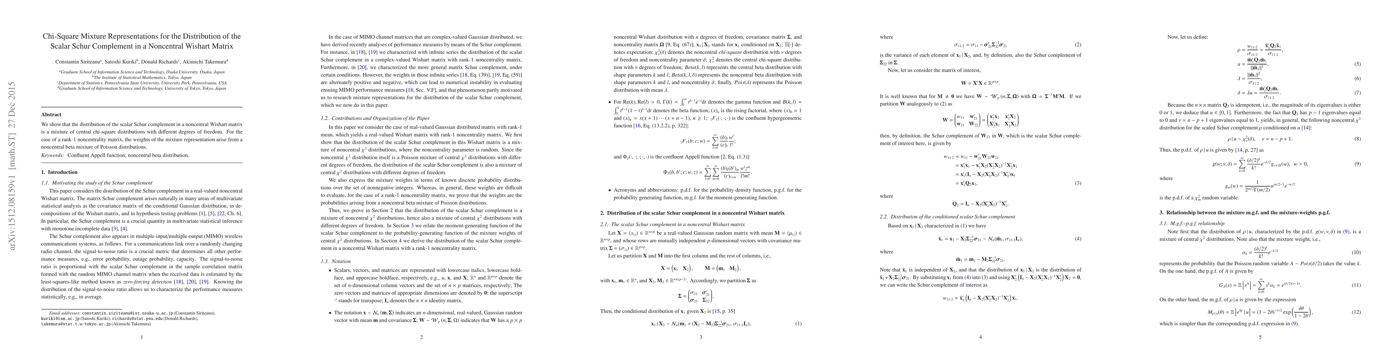 This paper demonstrates that the scalar Schur complement in a noncentral Wishart matrix follows a mixture of central chi-square distributions. Specifically, for rank-1 noncentrality, the mixture weights derive from a noncentral beta mixture of Poisson distributions.