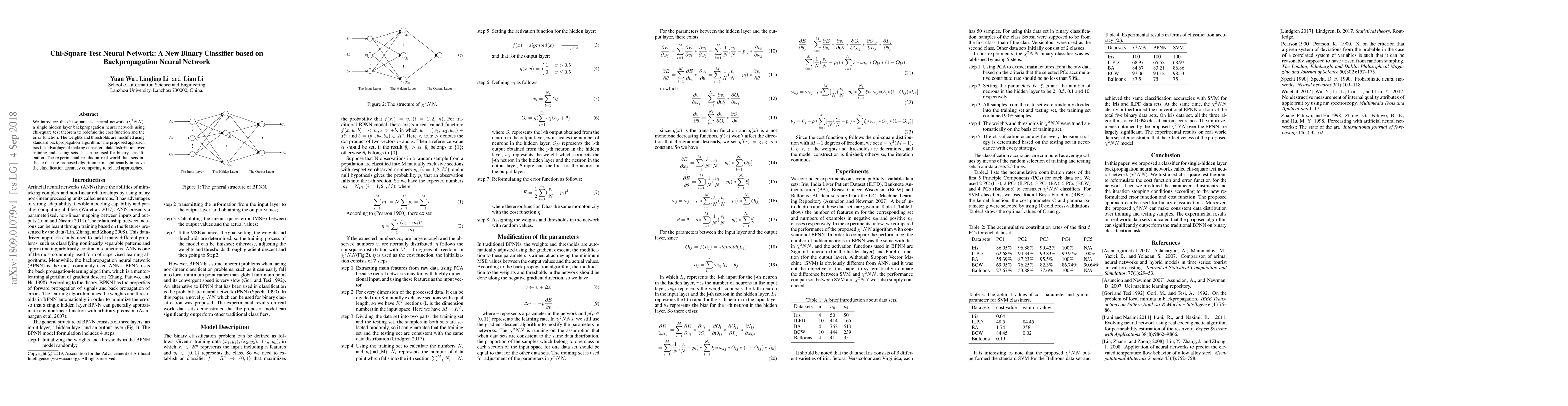 The Chi-Square Test Neural Network employs a backpropagation algorithm with a redefined cost function based on the chi-square test, aiming to improve binary classification accuracy. Experimental results show significant improvements over existing methods.