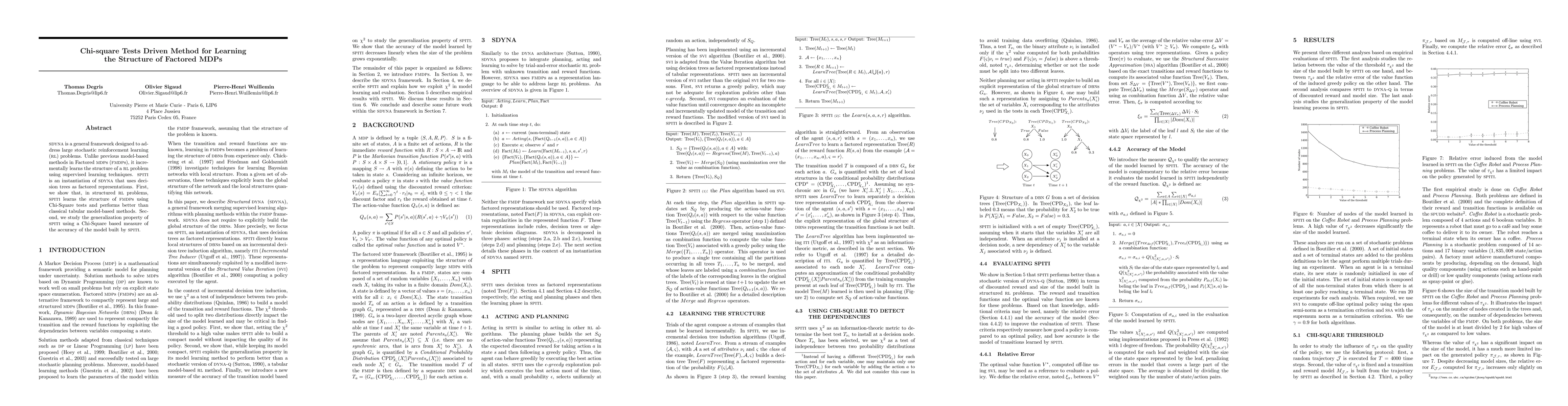 SDYNA is a general framework designed to address large stochastic reinforcement learning problems. Unlike previous model based methods in FMDPs, it incrementally learns the structure and the parameters of a RL problem using supervised learning techniques. Then, it integrates decision-theoric planning algorithms based on FMDPs to compute its policy. SPITI is an instanciation of SDYNA that exploits ITI, an incremental decision tree algorithm, to learn the reward function and the Dynamic Bayesian Networks with local structures representing the transition function of the problem. These representations are used by an incremental version of the Structured Value Iteration algorithm. In order to learn the structure, SPITI uses Chi-Square tests to detect the independence between two probability distributions. Thus, we study the relation between the threshold used in the Chi-Square test, the size of the model built and the relative error of the value function of the induced policy with respect to the optimal value. We show that, on stochastic problems, one can tune the threshold so as to generate both a compact model and an efficient policy. Then, we show that SPITI, while keeping its model compact, uses the generalization property of its learning method to perform better than a stochastic classical tabular algorithm in large RL problem with an unknown structure. We also introduce a new measure based on Chi-Square to qualify the accuracy of the model learned by SPITI. We qualitatively show that the generalization property in SPITI within the FMDP framework may prevent an exponential growth of the time required to learn the structure of large stochastic RL problems.