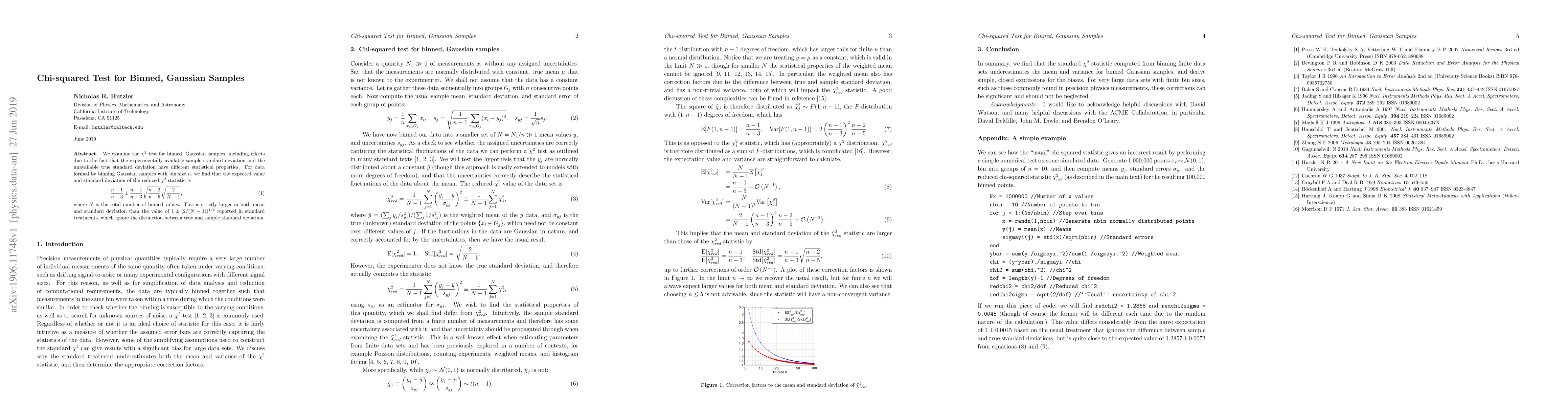 We examine the $\chi^2$ test for binned, Gaussian samples, including effects due to the fact that the experimentally available sample standard deviation and the unavailable true standard deviation have different statistical properties. For data formed by binning Gaussian samples with bin size $n$, we find that the expected value and standard deviation of the reduced $\chi^2$ statistic is \begin{equation} \frac{n-1}{n-3}\pm \frac{n-1}{n-3}\sqrt{\frac{n-2}{n-5}}\sqrt{\frac{2}{N-1}}, \end{equation} where $N$ is the total number of binned values. This is strictly larger in both mean and standard deviation than the value of $1\pm (2/(N-1))^{1/2}$ reported in standard treatments, which ignore the distinction between true and sample standard deviation.