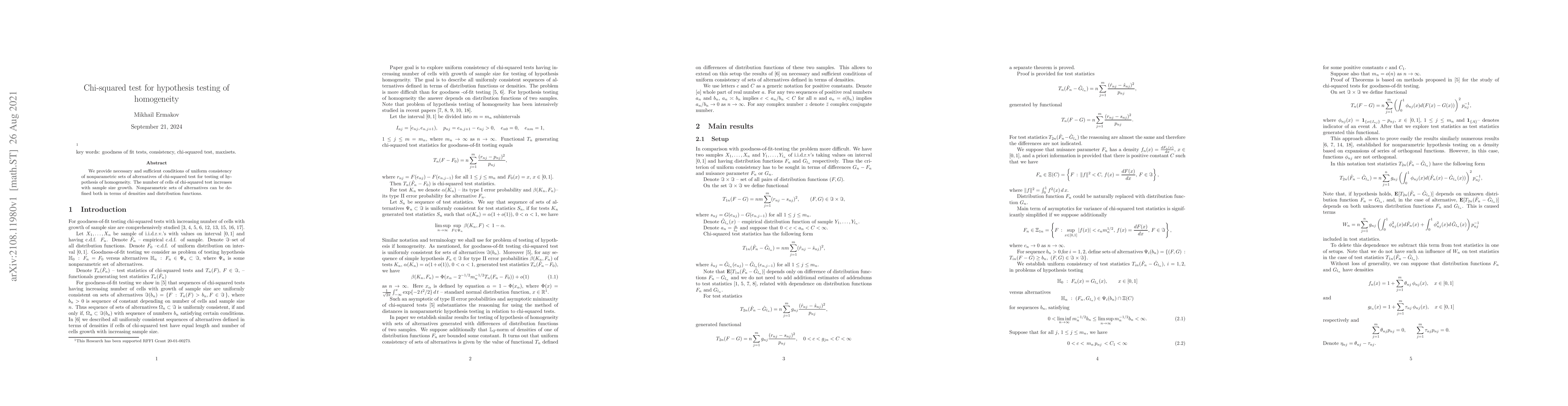 This paper establishes uniform consistency conditions for the chi-squared test used in hypothesis testing for homogeneity, addressing the growth of test cells with sample size. It defines nonparametric alternative sets based on densities and distribution functions.