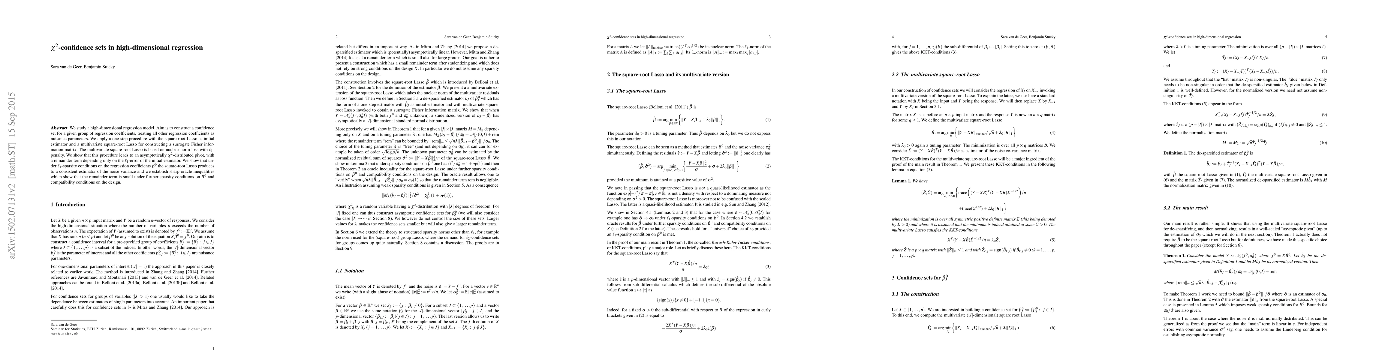 We study a high-dimensional regression model. Aim is to construct a confidence set for a given group of regression coefficients, treating all other regression coefficients as nuisance parameters. We apply a one-step procedure with the square-root Lasso as initial estimator and a multivariate square-root Lasso for constructing a surrogate Fisher information matrix. The multivariate square-root Lasso is based on nuclear norm loss with $\ell_1$-penalty. We show that this procedure leads to an asymptotically $\chi^2$-distributed pivot, with a remainder term depending only on the $\ell_1$-error of the initial estimator. We show that under $\ell_1$-sparsity conditions on the regression coefficients $\beta^0$ the square-root Lasso produces to a consistent estimator of the noise variance and we establish sharp oracle inequalities which show that the remainder term is small under further sparsity conditions on $\beta^0$ and compatibility conditions on the design.