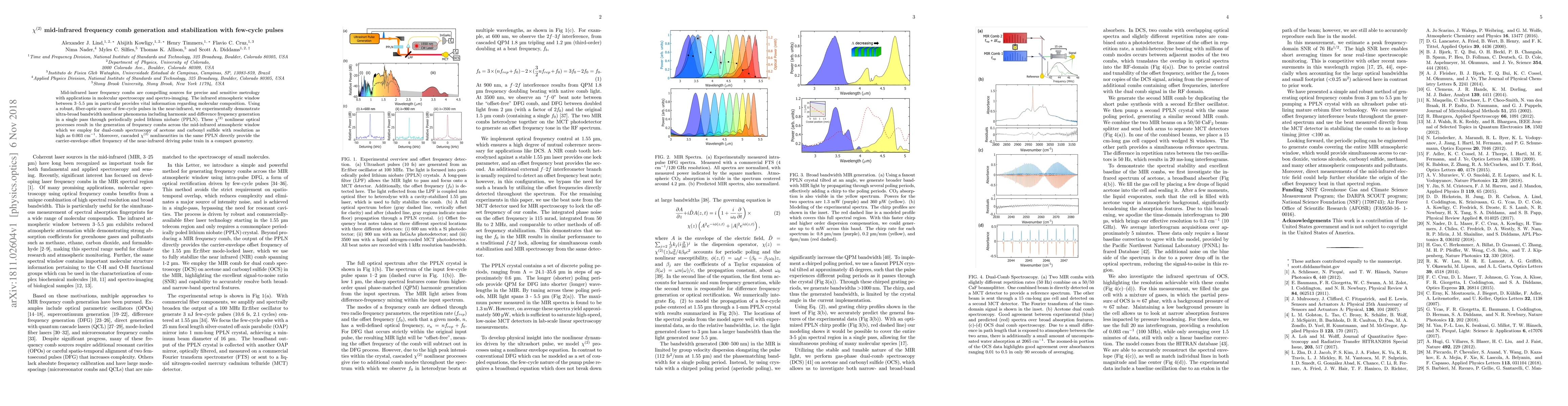 The research utilizes a robust, fiber-optic source of few-cycle pulses in the near-infrared, focusing them into periodically poled lithium niobate (PPLN) crystals for harmonic and difference frequency generation, resulting in the generation of frequency combs across the mid-infrared atmospheric window.