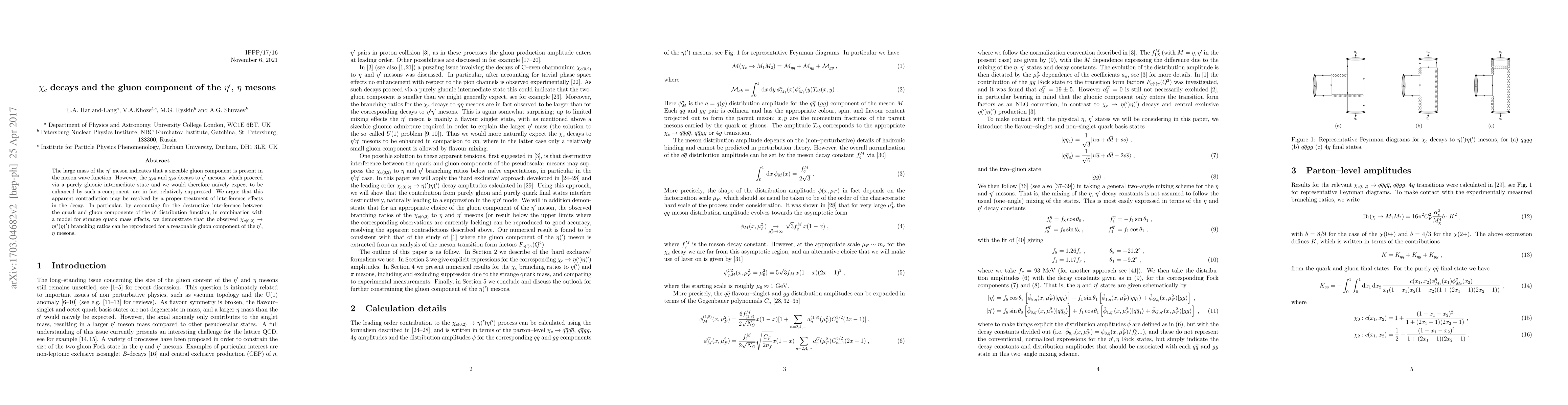 This paper investigates the suppression of $\chi_{c0}$ and $\chi_{c2}$ decays to $\eta'$ mesons, despite the $\eta'$'s large mass suggesting a significant gluon component. The authors resolve the contradiction by considering interference effects and the destructive interference between quark and gluon components in the $\eta'$ distribution function, showing that observed decay ratios can be explained with a reasonable gluon content.