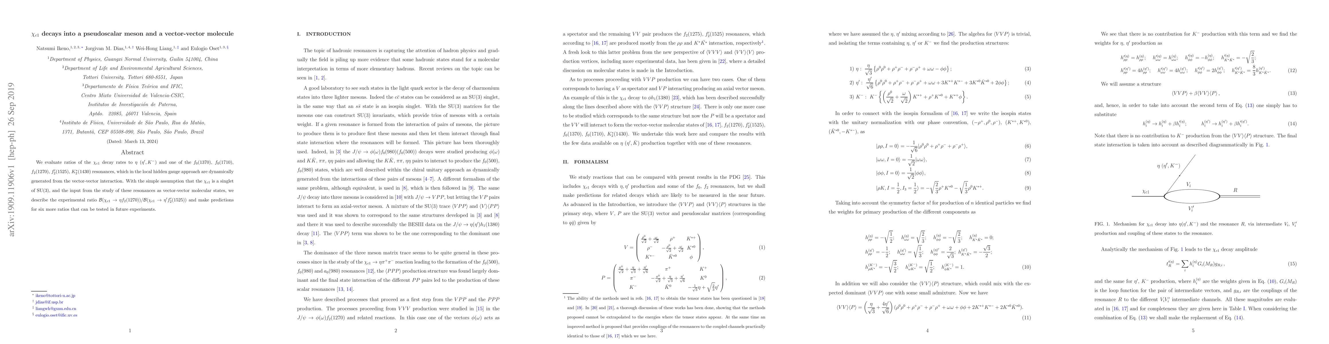 We evaluate ratios of the $\chi_{c1}$ decay rates to $\eta$ ($\eta', K^-$) and one of the $f_0(1370)$, $f_0(1710)$, $f_2(1270)$, $f_2'(1525)$, $K^{*}_2(1430)$ resonances, which in the local hidden gauge approach are dynamically generated from the vector-vector interaction. With the simple assumption that the $\chi_{c1}$ is a singlet of SU(3), and the input from the study of these resonances as vector-vector molecular states, we describe the experimental ratio $\mathcal{B}(\chi_{c1} \rightarrow \eta f_2(1270))/ \mathcal{B}(\chi_{c1} \rightarrow \eta' f_2'(1525))$ and make predictions for six more ratios that can be tested in future experiments.