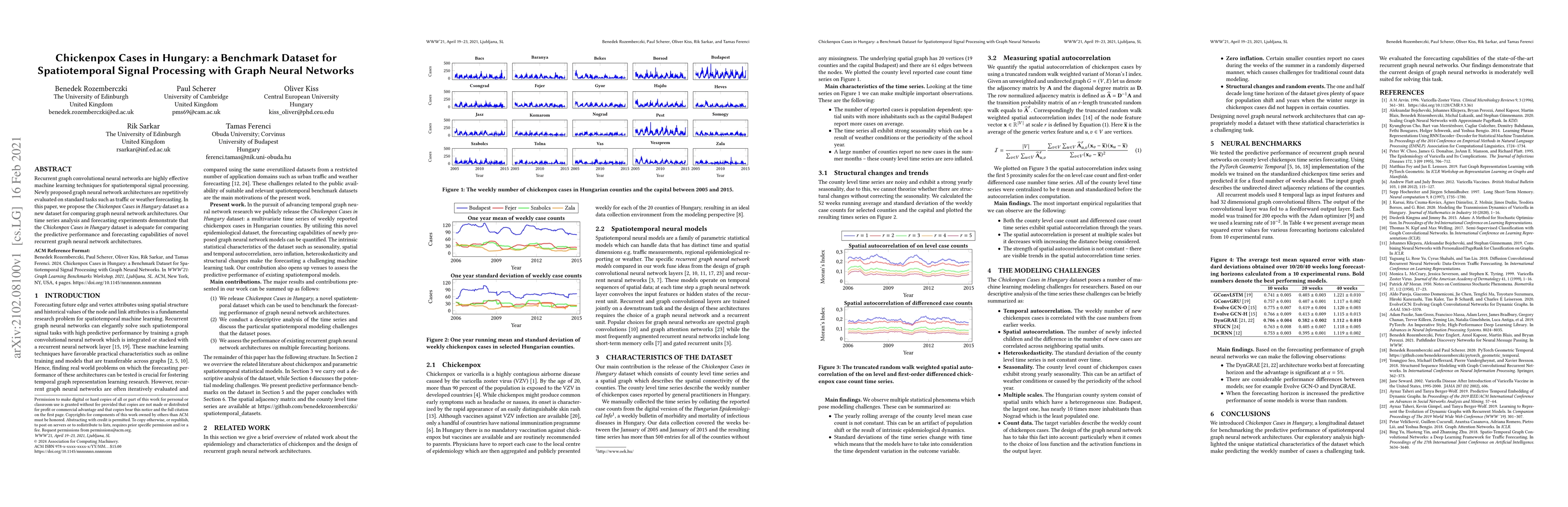 This paper introduces the Chickenpox Cases in Hungary dataset for evaluating spatiotemporal signal processing using graph neural networks. The dataset enables comparisons of the predictive performance and forecasting capabilities of various graph neural network architectures.