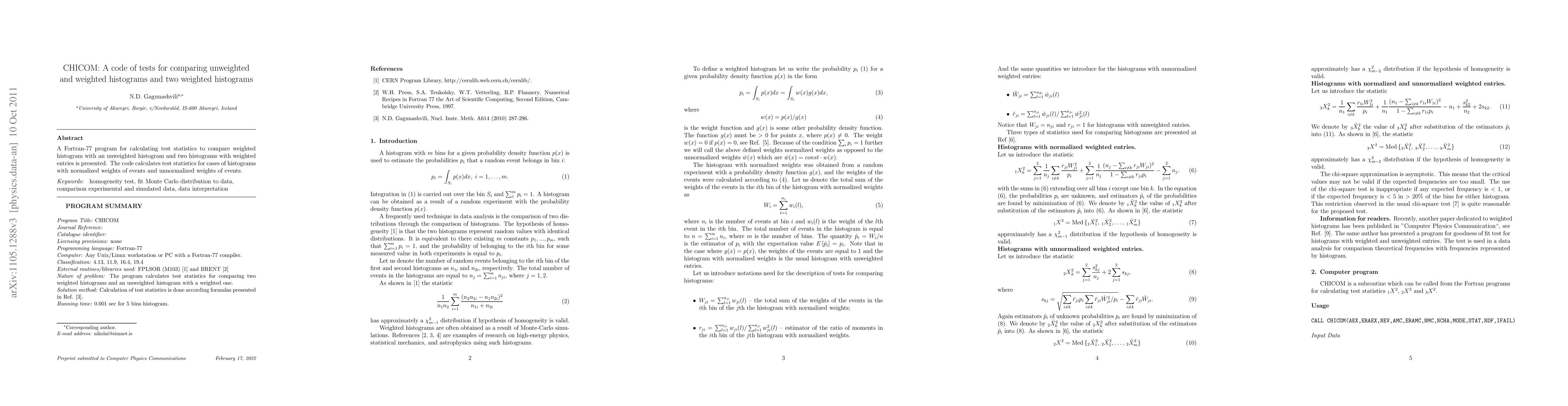 Summary: CHICOM is a Fortran-77 program designed to compute test statistics for comparing unweighted and weighted histograms, as well as two histograms with weighted entries. It handles both normalized and unnormalized weights of events.