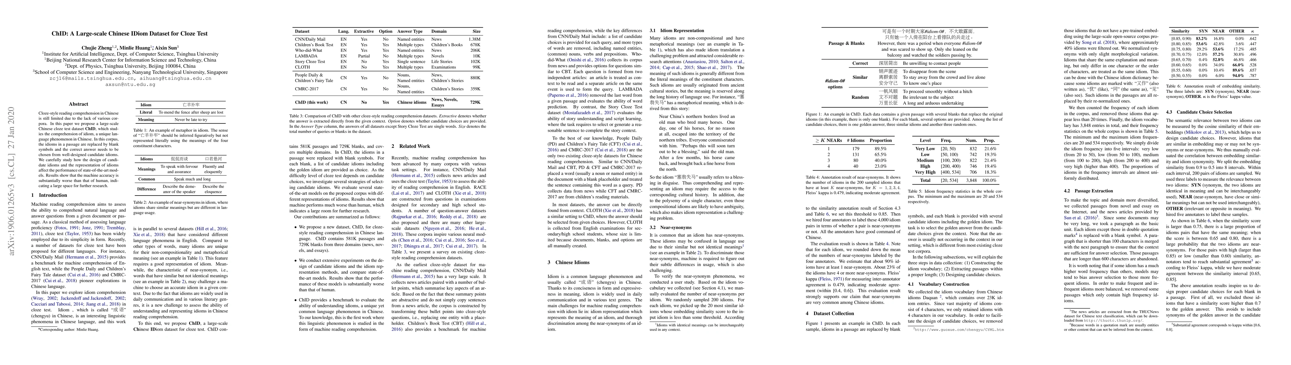 The paper introduces ChID, a large-scale Chinese cloze test dataset focused on idiom comprehension, aiming to enhance Chinese reading comprehension. Results reveal that current models perform poorly compared to humans, indicating significant room for improvement in this area.