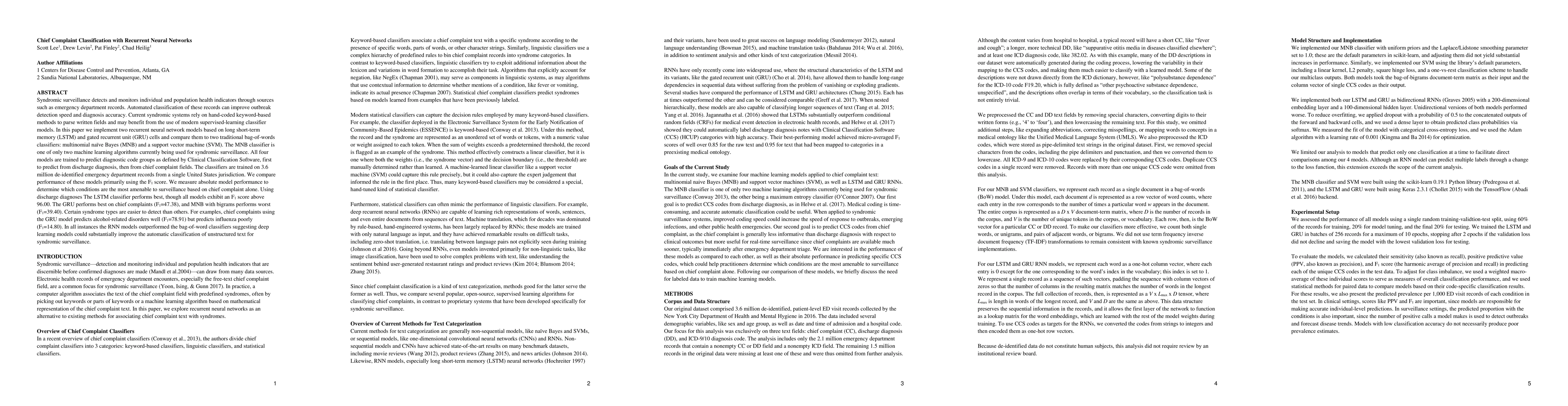 Syndromic surveillance detects and monitors individual and population health indicators through sources such as emergency department records. Automated classification of these records can improve outbreak detection speed and diagnosis accuracy. Current syndromic systems rely on hand-coded keyword-based methods to parse written fields and may benefit from the use of modern supervised-learning classifier models. In this paper we implement two recurrent neural network models based on long short-term memory (LSTM) and gated recurrent unit (GRU) cells and compare them to two traditional bag-of-words classifiers: multinomial naive Bayes (MNB) and a support vector machine (SVM). The MNB classifier is one of only two machine learning algorithms currently being used for syndromic surveillance. All four models are trained to predict diagnostic code groups as defined by Clinical Classification Software, first to predict from discharge diagnosis, then from chief complaint fields. The classifiers are trained on 3.6 million de-identified emergency department records from a single United States jurisdiction. We compare performance of these models primarily using the F1 score. Using discharge diagnoses, the LSTM classifier performs best, though all models exhibit an F1 score above 96.00. The GRU performs best on chief complaints (F1=47.38), and MNB with bigrams performs worst (F1=39.40). Certain syndrome types are easier to detect than others. For examples, chief complaints using the GRU model predicts alcohol-related disorders well (F1=78.91) but predicts influenza poorly (F1=14.80). In all instances, the RNN models outperformed the bag-of-word classifiers, suggesting deep learning models could substantially improve the automatic classification of unstructured text for syndromic surveillance.