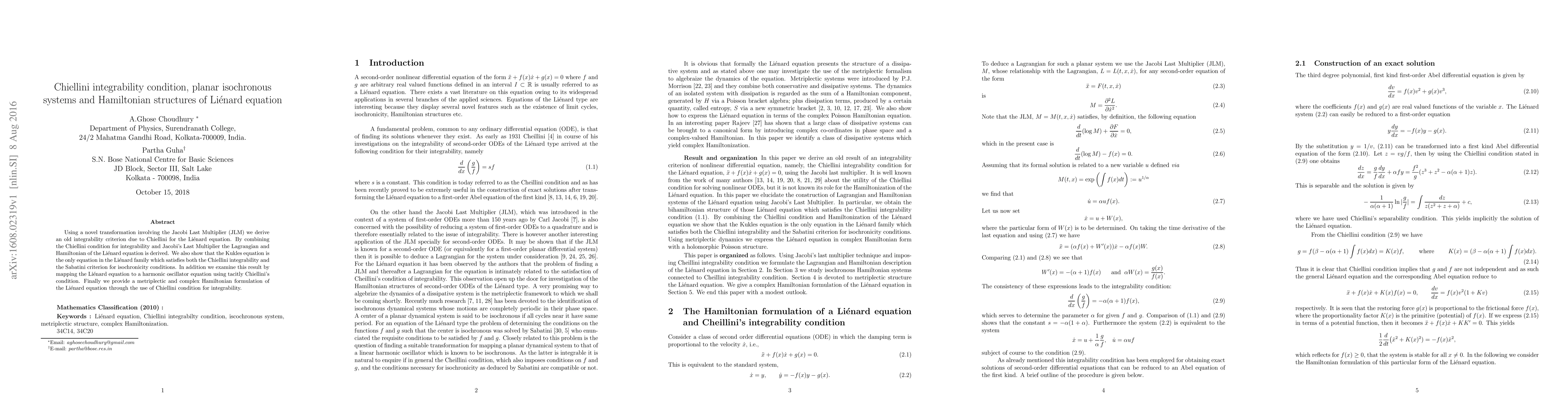 Using a novel transformation involving the Jacobi Last Multiplier (JLM) we derive an old integrability criterion due to Chiellini for the Li\'enard equation. By combining the Chiellini condition for integrability and Jacobi's Last Multiplier the Lagrangian and Hamiltonian of the Li\'enard equation is derived. We also show that the Kukles equation is the only equation in the Li\'enard family which satisfies both the Chiellini integrability and the Sabatini criterion for isochronicity conditions. In addition we examine this result by mapping the Li\'enard equation to a harmonic oscillator equation using tacitly Chiellini's condition. Finally we provide a metriplectic and complex Hamiltonian formulation of the Li\'enard equation through the use of Chiellini condition for integrability.