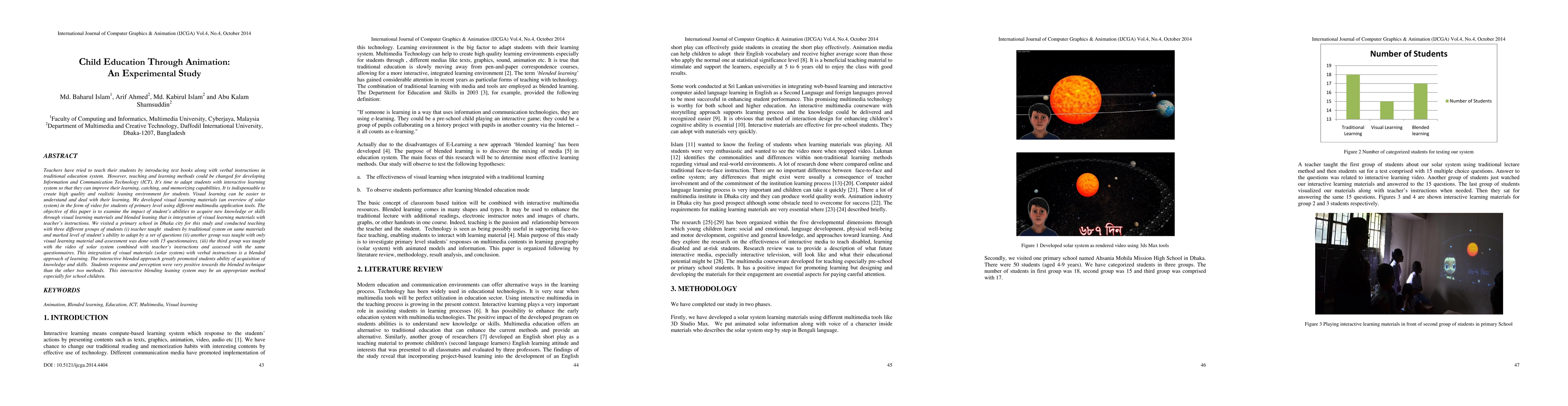 Teachers have tried to teach their students by introducing text books along with verbal instructions in traditional education system. However, teaching and learning methods could be changed for developing Information and Communication Technology. It's time to adapt students with interactive learning system so that they can improve their learning, catching, and memorizing capabilities. It is indispensable to create high quality and realistic leaning environment for students. Visual learning can be easier to understand and deal with their learning. We developed visual learning materials in the form of video for students of primary level using different multimedia application tools. The objective of this paper is to examine the impact of students abilities to acquire new knowledge or skills through visual learning materials and blended leaning that is integration of visual learning materials with teachers instructions. We visited a primary school in Dhaka city for this study and conducted teaching with three different groups of students, (i) teacher taught students by traditional system on same materials and marked level of students ability to adapt by a set of questions, (ii) another group was taught with only visual learning material and assessment was done with 15 questionnaires, (iii) the third group was taught with the video of solar system combined with teachers instructions and assessed with the same questionnaires. This integration of visual materials with verbal instructions is a blended approach of learning. The interactive blended approach greatly promoted students ability of acquisition of knowledge and skills. Students response and perception were very positive towards the blended technique than the other two methods. This interactive blending leaning system may be an appropriate method especially for school children.