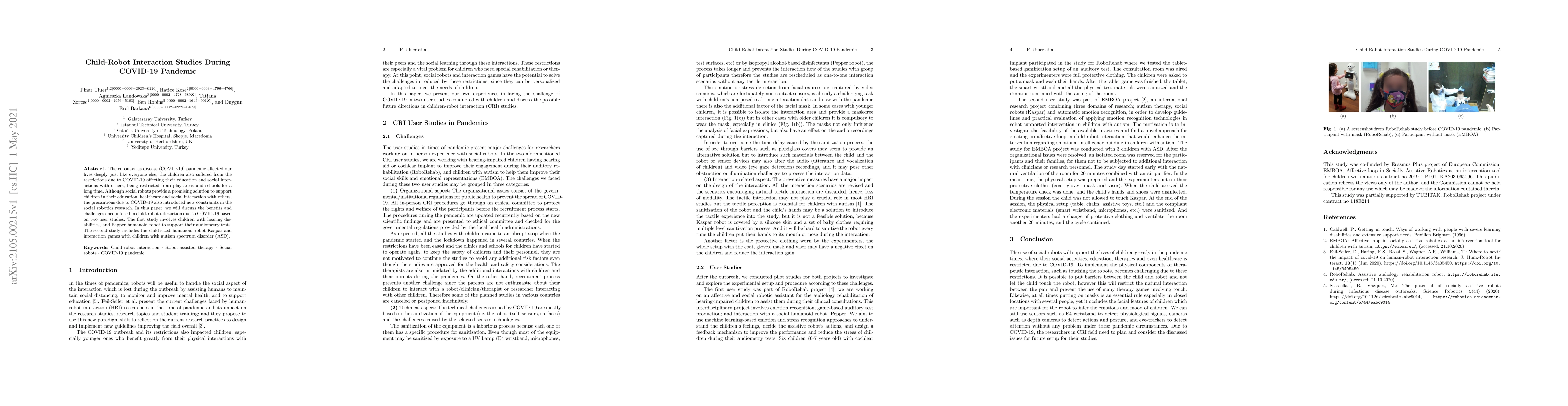 This paper investigates the benefits and challenges of child-robot interactions during the COVID-19 pandemic through two studies: one with children with hearing disabilities using the Pepper robot for audiometry support, and another with children with autism using the Kaspar robot in interactive games.