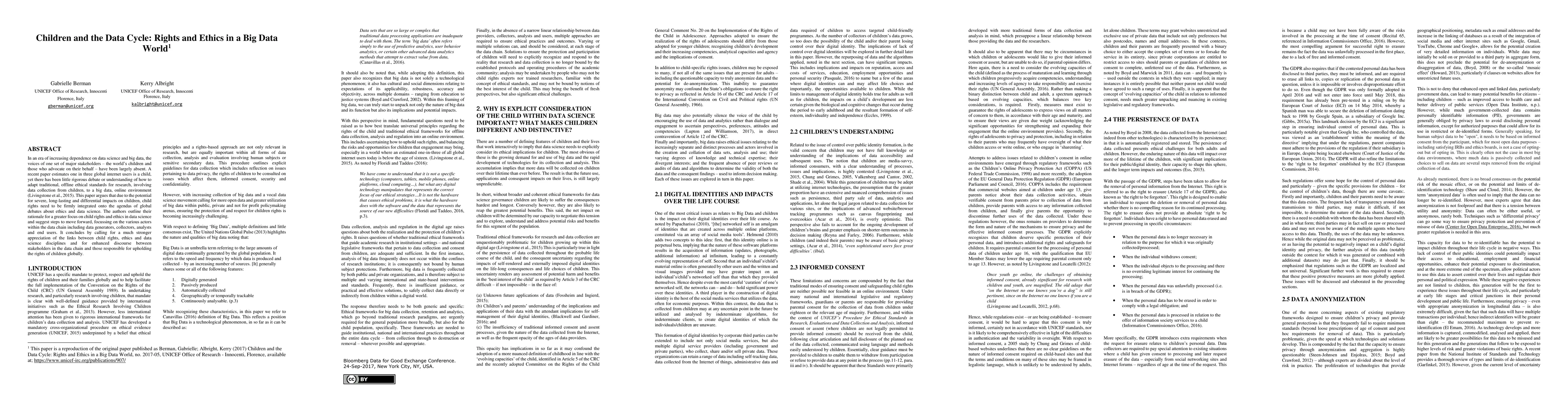 This paper emphasizes the need to integrate child rights into global debates on ethics and data science, highlighting the severe impacts of big data practices on children. It calls for a stronger appreciation of ethical standards in data science and enhanced discourse among stakeholders to protect children's rights in the digital age.