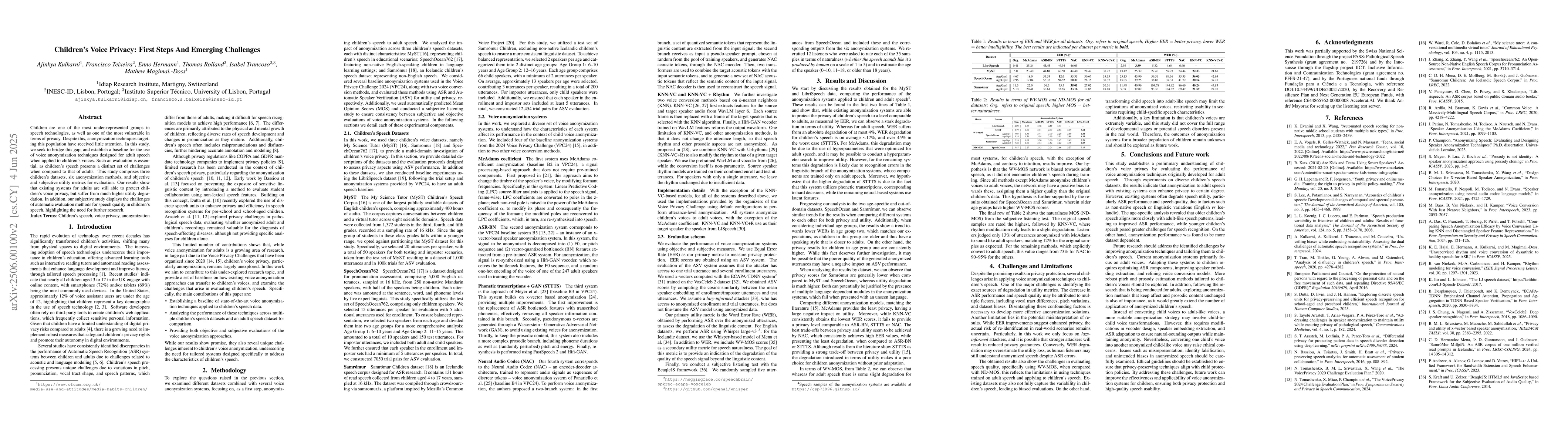 This research establishes a baseline for children's voice privacy, identifies challenges in applying voice anonymization techniques to children's speech, and highlights the need for tailored solutions to improve privacy protection and speech usability for children.