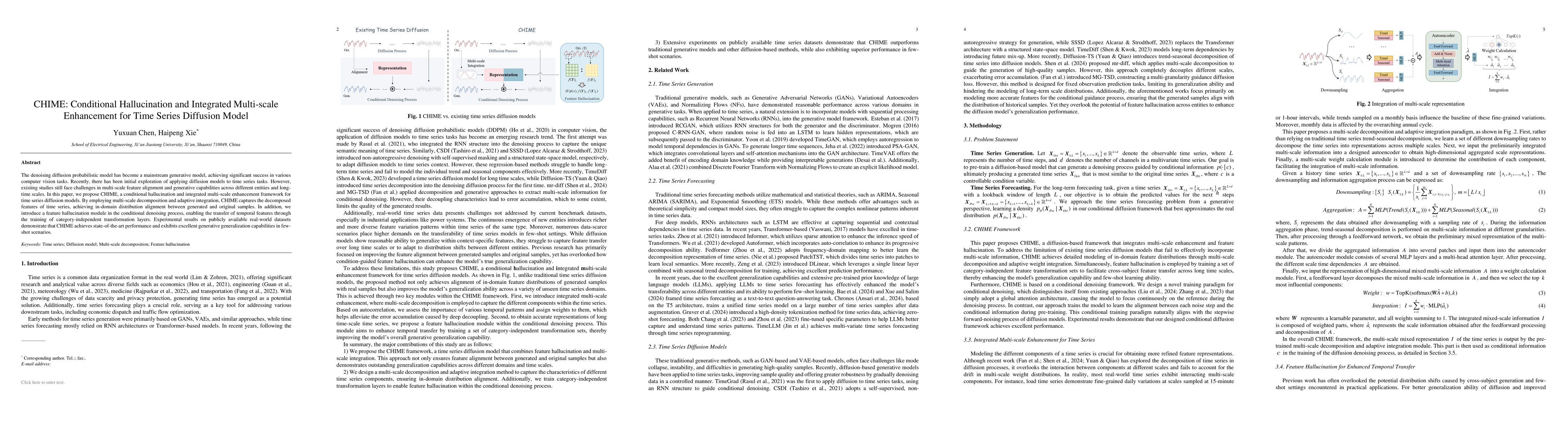 CHIME introduces a novel approach to time series diffusion models by incorporating multi-scale decomposition, adaptive integration, and a feature hallucination module, addressing existing challenges in the field.