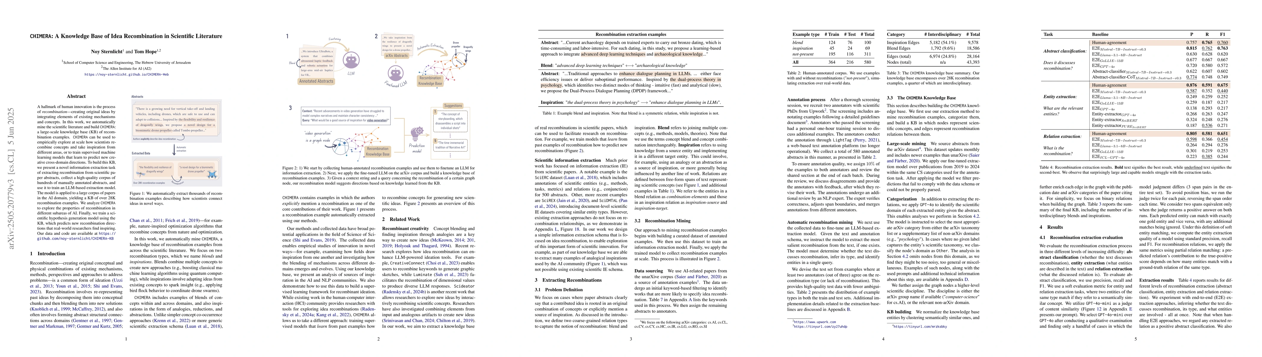 The research presents a novel information extraction task to mine scientific literature, focusing on identifying idea recombination in abstracts. A high-quality corpus of manually annotated abstracts is collected and used to train a language model-based extraction model. This model is then applied to a large AI domain corpus to build CHIMERA, a knowledge base of over 28K recombination examples.