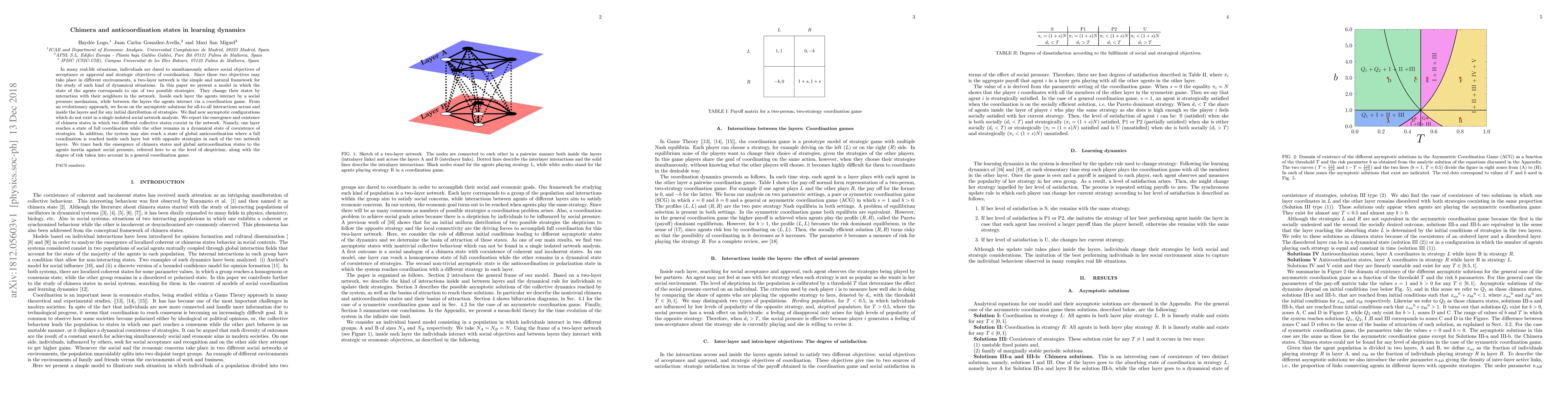 This paper models a two-layer network where agents interact to achieve social and strategic objectives, revealing the emergence of chimera states and global anticoordination due to agents' skepticism and risk-taking behavior. The study finds that one layer can fully coordinate while the other remains in a mixed state, and vice versa for global anticoordination.
