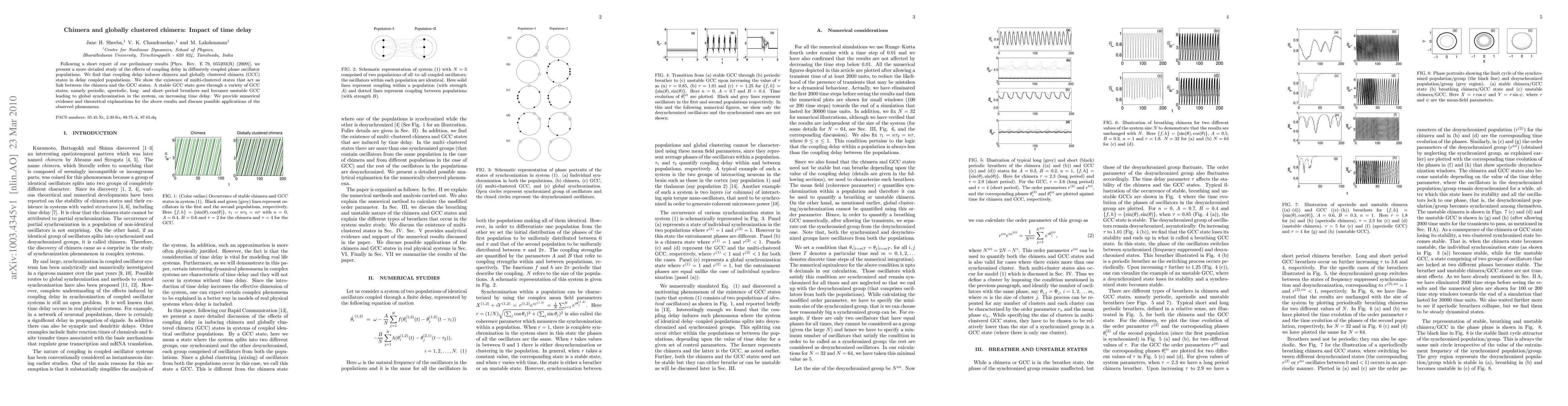 This paper investigates the impact of coupling delay in diffusively coupled phase oscillator populations, revealing that it induces chimera and globally clustered chimera (GCC) states. The study provides numerical evidence and theoretical explanations for the transition from GCC states to global synchronization as time delay increases.