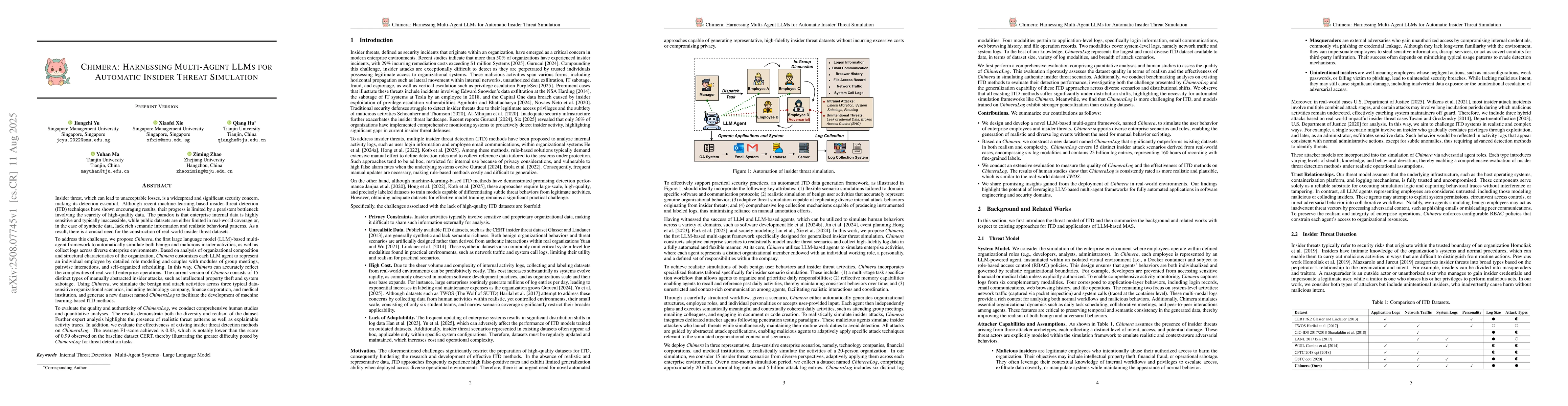 Chimera introduces a multi-agent LLM-based framework for automatic insider threat simulation, generating a high-quality, diverse dataset for ITD research.