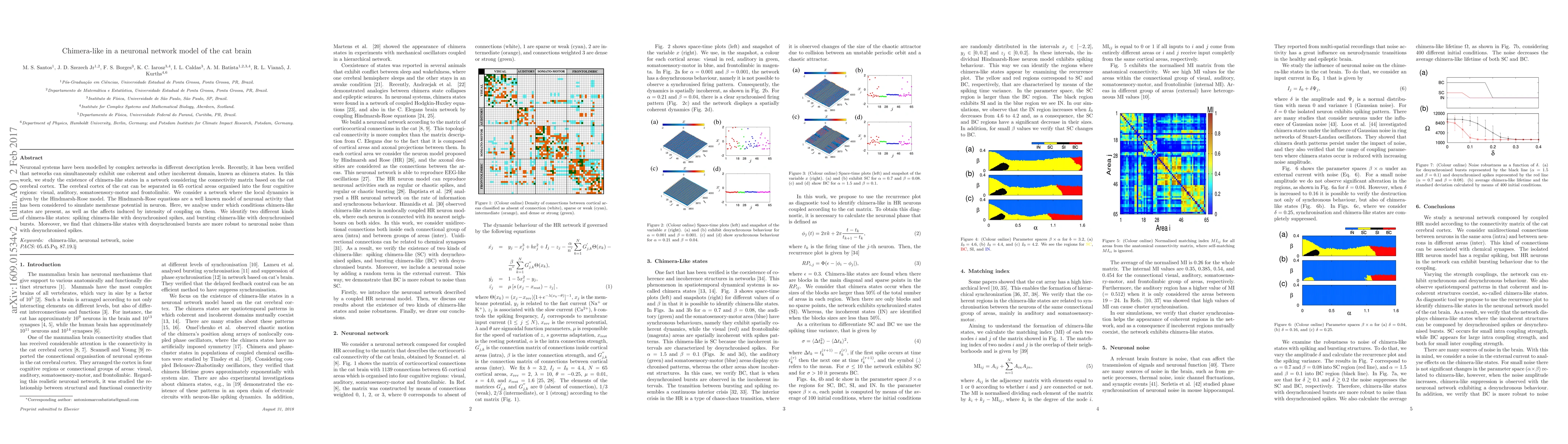 Neuronal systems have been modeled by complex networks in different description levels. Recently, it has been verified that networks can simultaneously exhibit one coherent and other incoherent domain, known as chimera states. In this work, we study the existence of chimera states in a network considering the connectivity matrix based on the cat cerebral cortex. The cerebral cortex of the cat can be separated in 65 cortical areas organised into the four cognitive regions: visual, auditory, somatosensory-motor and frontolimbic. We consider a network where the local dynamics is given by the Hindmarsh-Rose model. The Hindmarsh-Rose equations are a well known model of neuronal activity that has been considered to simulate membrane potential in neuron. Here, we analyse under which conditions chimera states are present, as well as the affects induced by intensity of coupling on them. We observe the existence of chimera states in that incoherent structure can be composed of desynchronised spikes or desynchronised bursts. Moreover, we find that chimera states with desynchronised bursts are more robust to neuronal noise than with desynchronised spikes.