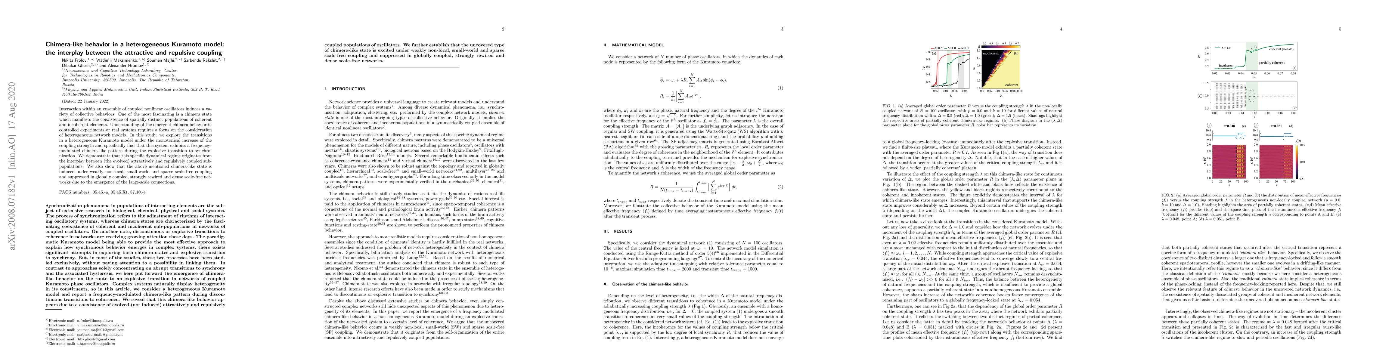 This study investigates the emergence of chimera-like behavior in a heterogeneous Kuramoto model, revealing a frequency-modulated pattern during synchronization transitions. The observed dynamical regime arises from the interplay between attractive and repulsive coupling, with chimera states induced by weakly non-local, small-world, and sparse scale-free networks.