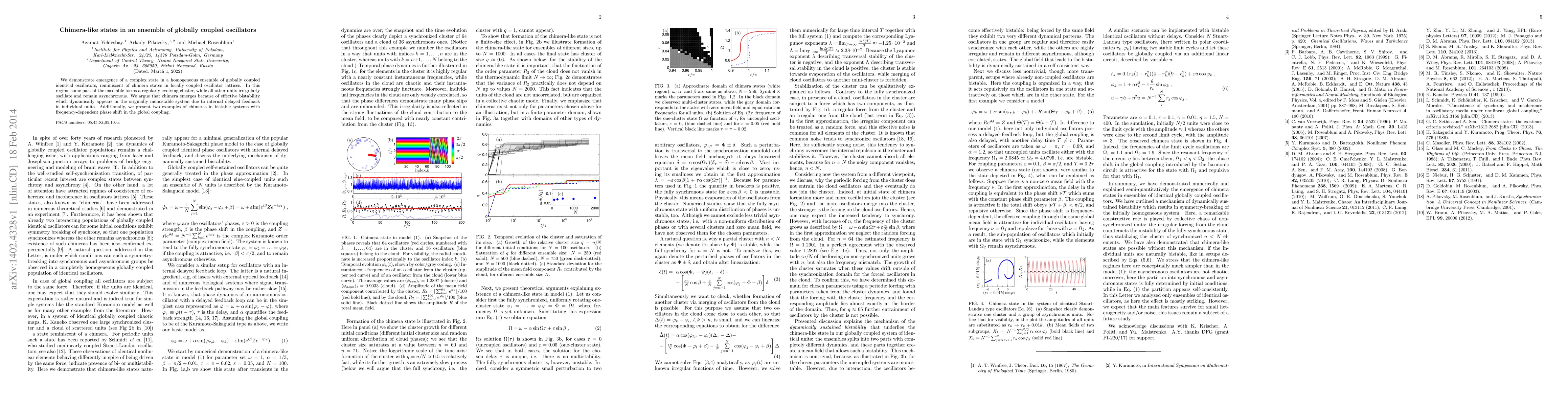 This paper explores the emergence of chimera states in globally coupled oscillators, demonstrating that some oscillators synchronize while others remain asynchronous due to internal delayed feedback creating effective bistability. It also provides examples of chimeras in bistable systems with frequency-dependent global coupling.