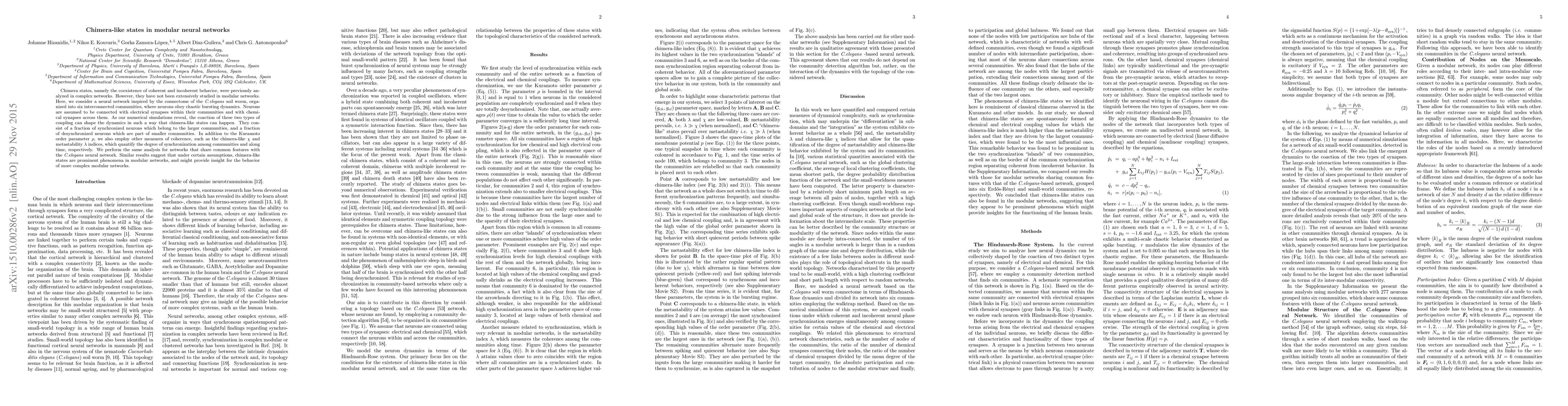 This paper investigates chimera-like states in modular neural networks, specifically the \textit{C.elegans} network, where synchronized and desynchronized neurons coexist. Numerical simulations show that chimera-like states emerge due to the interplay of electrical and chemical synapses, and are quantified using the Kuramoto order parameter and other coherence indices.