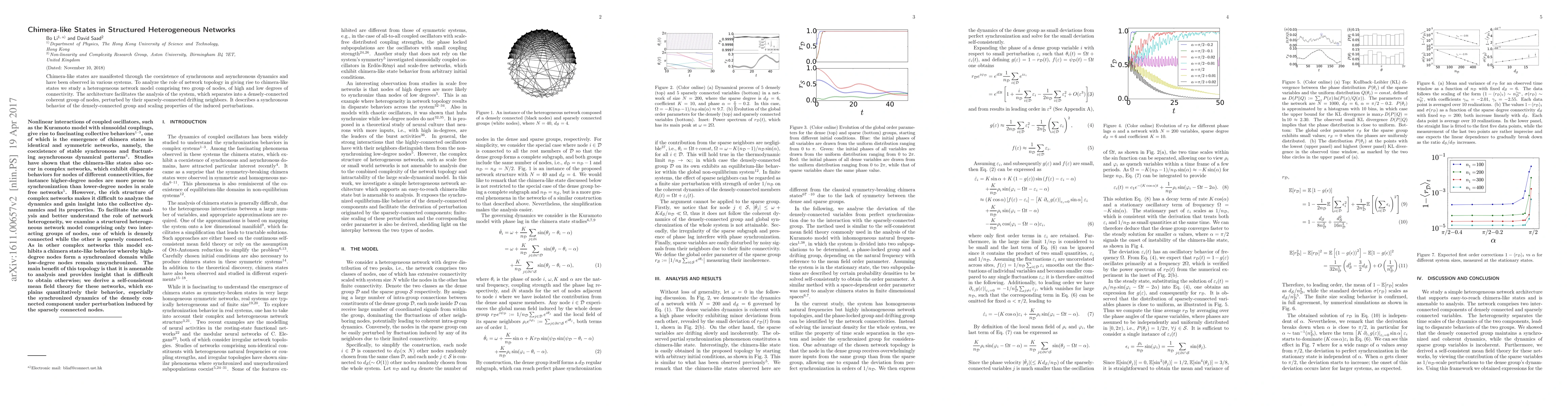 Chimera-like states are manifested through the coexistence of synchronous and asynchronous dynamics and have been observed in various systems. To analyze the role of network topology in giving rise to chimera-like states we study a heterogeneous network model comprising two group of nodes, of high and low degrees of connectivity. The architecture facilitates the analysis of the system, which separates into a densely-connected coherent group of nodes, perturbed by their sparsely-connected drifting neighbors. It describes a synchronous behavior of the densely-connected group and scaling properties of the induced perturbations.