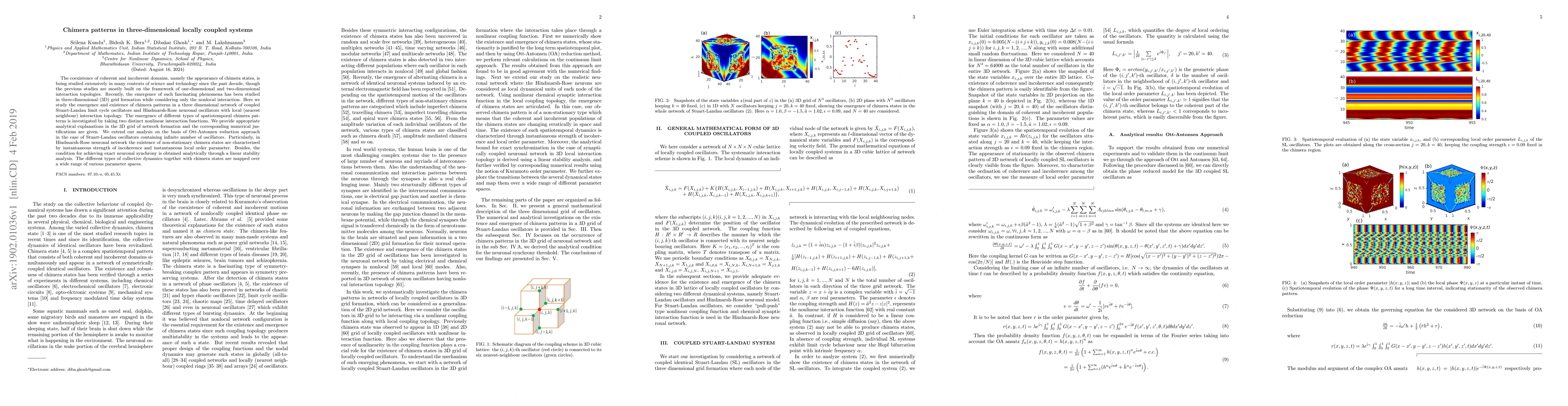 This paper investigates the emergence of chimera patterns in three-dimensional networks of locally coupled Stuart-Landau and Hindmarsh-Rose oscillators, exploring various spatiotemporal dynamics and non-stationary states. Analytical and numerical methods, including Ott-Antonsen reduction, are used to characterize these phenomena across different parameter spaces.