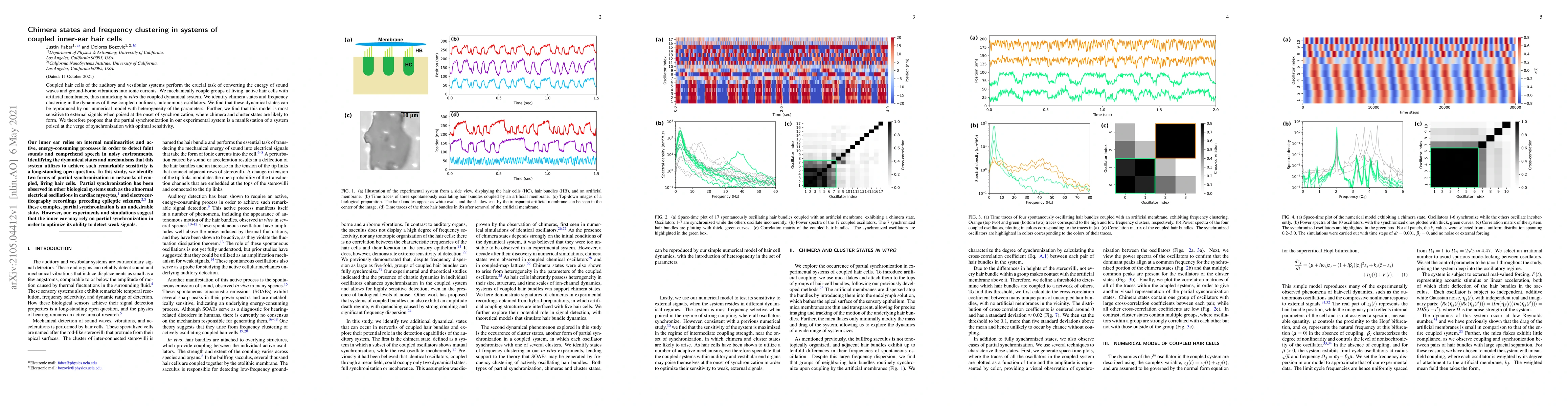 Coupled hair cells of the auditory and vestibular systems perform the crucial task of converting the energy of sound waves and ground-borne vibrations into ionic currents. We mechanically couple groups of living, active hair cells with artificial membranes, thus mimicking in vitro the coupled dynamical system. We identify chimera states and frequency clustering in the dynamics of these coupled nonlinear, autonomous oscillators. We find that these dynamical states can be reproduced by our numerical model with heterogeneity of the parameters. Further, we find that this model is most sensitive to external signals when poised at the onset of synchronization, where chimera and cluster states are likely to form. We therefore propose that the partial synchronization in our experimental system is a manifestation of a system poised at the verge of synchronization with optimal sensitivity.
