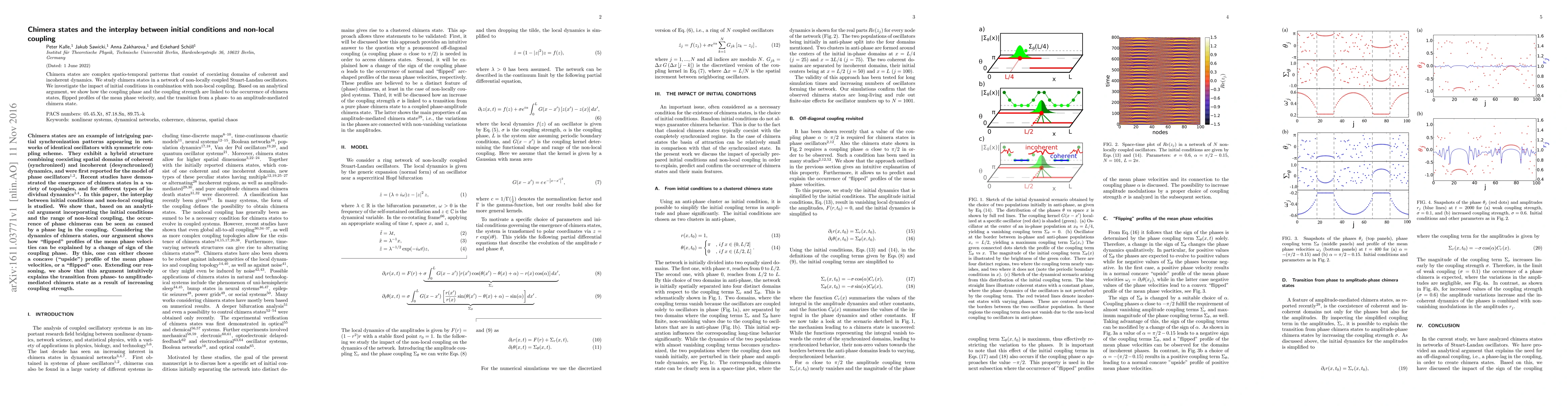 Chimera states are complex spatio-temporal patterns that consist of coexisting domains of coherent and incoherent dynamics. We study chimera states in a network of non-locally coupled Stuart-Landau oscillators. We investigate the impact of initial conditions in combination with non-local coupling. Based on an analytical argument, we show how the coupling phase and the coupling strength are linked to the occurrence of chimera states, flipped profiles of the mean phase velocity, and the transition from a phase- to an amplitude-mediated chimera state.