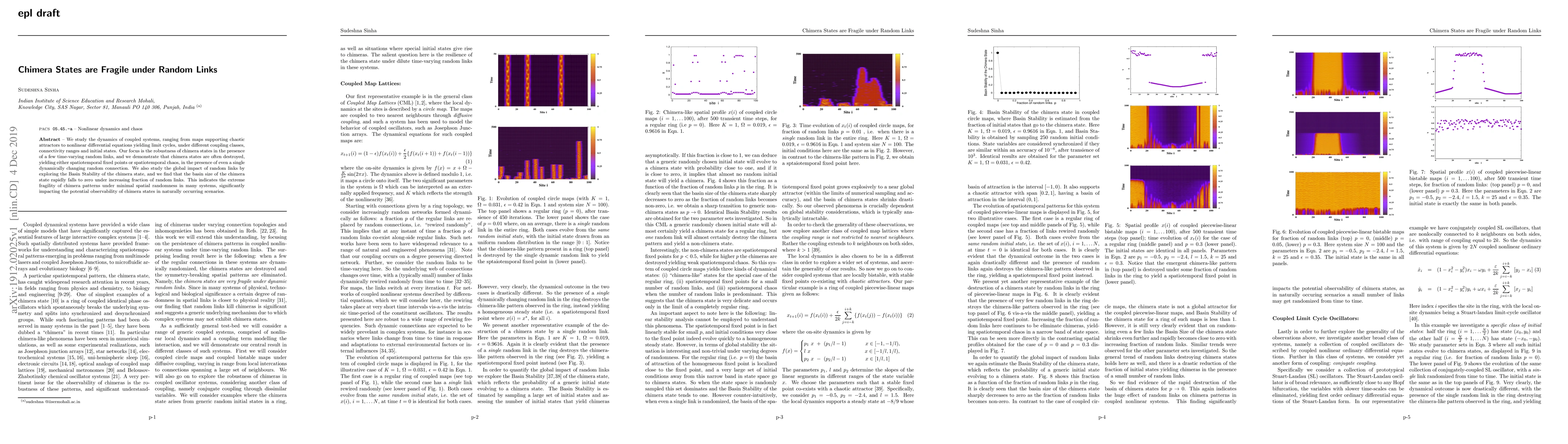 This paper investigates the fragility of chimera states in coupled dynamical systems under random links, showing that even a single dynamic random connection can destroy chimera states, leading to fixed points or chaos. The study reveals that the basin stability of chimera states diminishes rapidly with increasing random links, highlighting the extreme vulnerability of chimera patterns to spatial randomness.