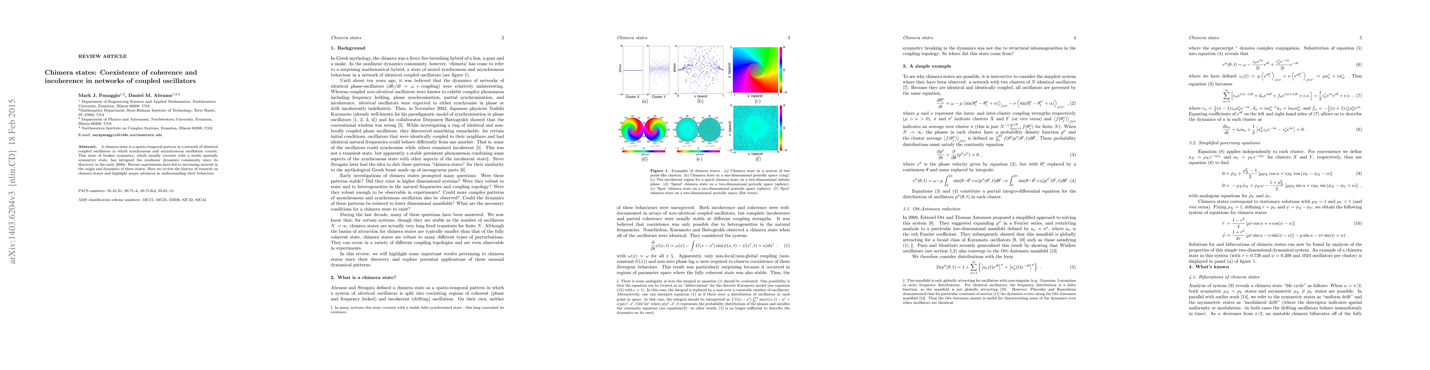 Summary: This paper reviews the history and major advances in understanding chimera states, a unique spatio-temporal pattern in coupled oscillator networks where coherence and incoherence coexist, sparking significant interest in nonlinear dynamics since their discovery.