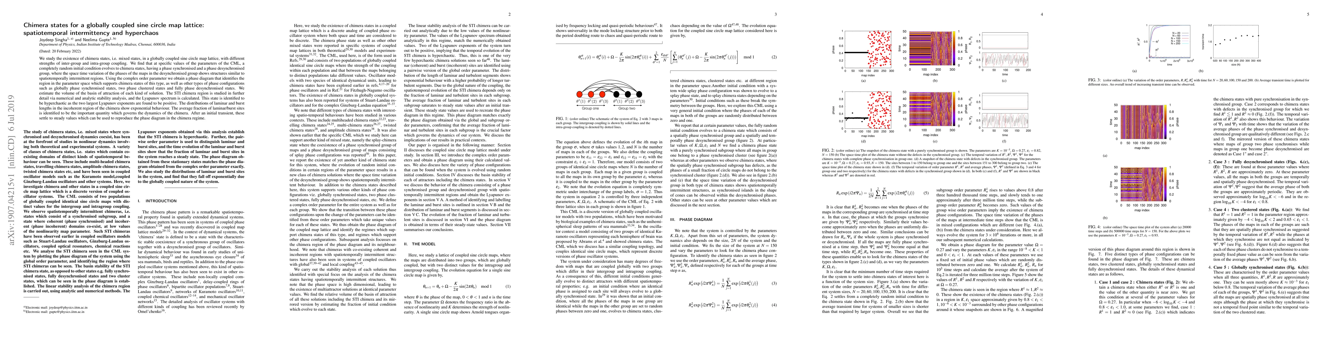 This paper investigates chimera states in a globally coupled sine circle map lattice, revealing spatiotemporal intermittency and hyperchaos. It identifies regions in parameter space supporting various phase configurations, including chimera states with intermittent phase desynchronization, and finds hyperchaos in the chimera regime with positive largest Lyapunov exponents.