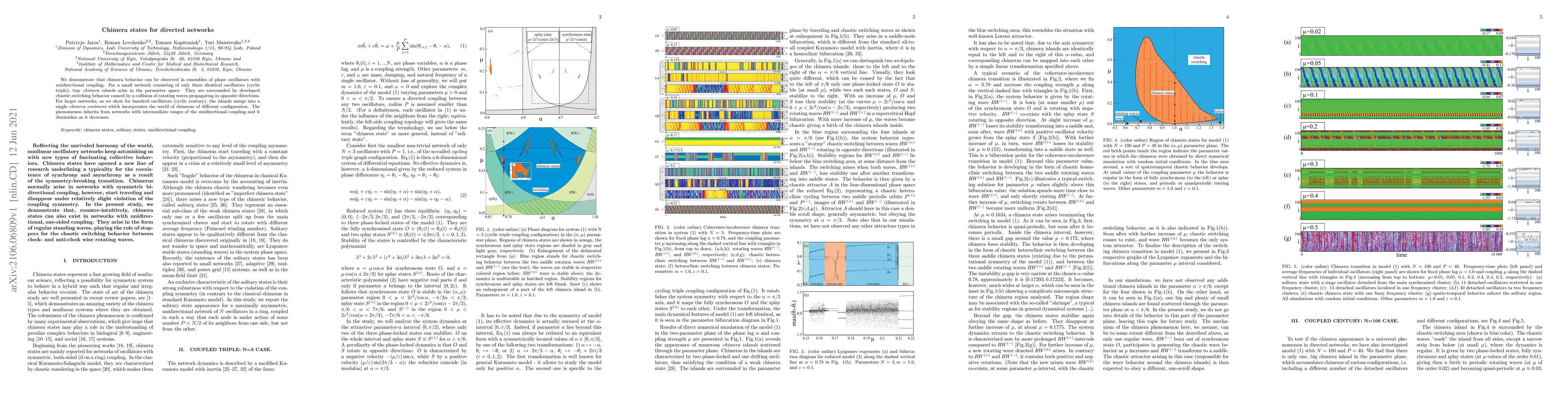 We demonstrate that chimera behavior can be observed in ensembles of phase oscillators with unidirectional coupling. For a small network consisting of only three identical oscillators (cyclic triple), tiny {\it chimera islands} arise in the parameter space. They are surrounded by developed chaotic switching behavior caused by a collision of rotating waves propagating in opposite directions. For larger networks, as we show for hundred oscillators (cyclic century), the islands merge into a single {\it chimera continent} which incorporates the world of chimeras of different configuration. The phenomenon inherits from networks with intermediate ranges of the unidirectional coupling and it diminishes as it decreases.