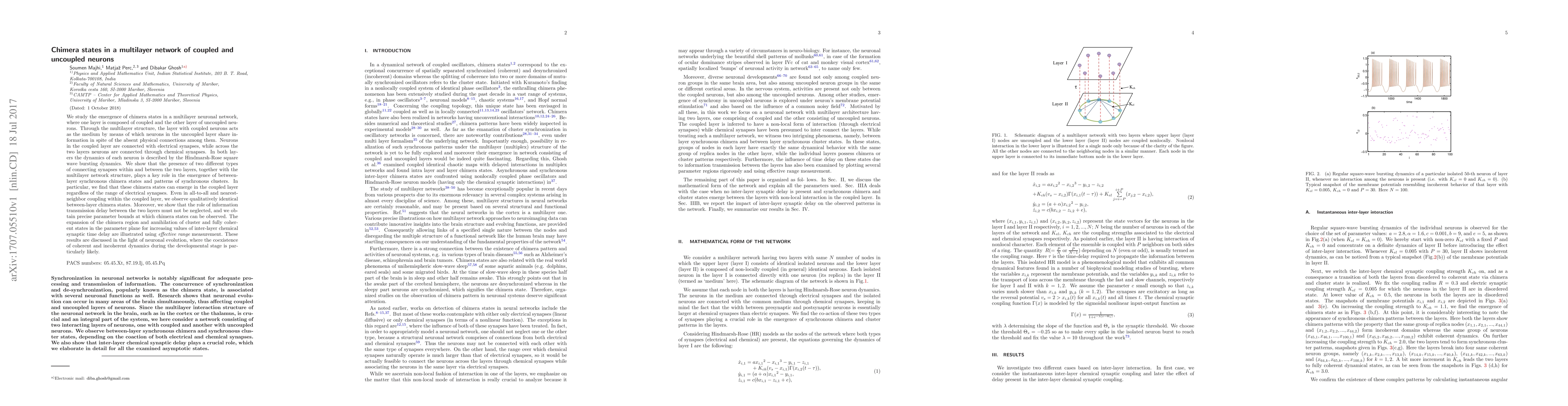 We study the emergence of chimera states in a multilayer neuronal network, where one layer is composed of coupled and the other layer of uncoupled neurons. Through the multilayer structure, the layer with coupled neurons acts as the medium by means of which neurons in the uncoupled layer share information in spite of the absent physical connections among them. Neurons in the coupled layer are connected with electrical synapses, while across the two layers neurons are connected through chemical synapses. In both layers the dynamics of each neuron is described by the Hindmarsh-Rose square wave bursting dynamics. We show that the presence of two different types of connecting synapses within and between the two layers, together with the multilayer network structure, plays a key role in the emergence of between-layer synchronous chimera states and patterns of synchronous clusters. In particular, we find that these chimera states can emerge in the coupled layer regardless of the range of electrical synapses. Even in all-to-all and nearest-neighbor coupling within the coupled layer, we observe qualitatively identical between-layer chimera states. Moreover, we show that the role of information transmission delay between the two layers must not be neglected, and we obtain precise parameter bounds at which chimera states can be observed. The expansion of the chimera region and annihilation of cluster and fully coherent states in the parameter plane for increasing values of inter-layer chemical synaptic time delay are illustrated using effective range measurement. These results are discussed in the light of neuronal evolution, where the coexistence of coherent and incoherent dynamics during the developmental stage is particularly likely.