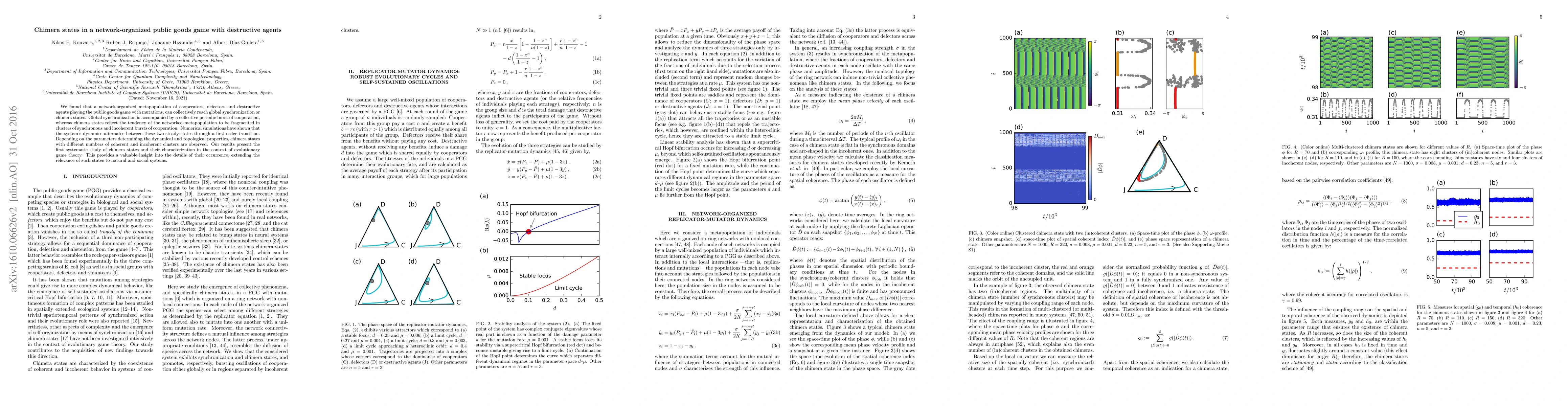 A network-organized public goods game with destructive agents can exhibit two steady states: global synchronization and chimera states, which reflect fragmented clusters of synchronous cooperation. These states alternate through a first-order transition depending on system parameters.