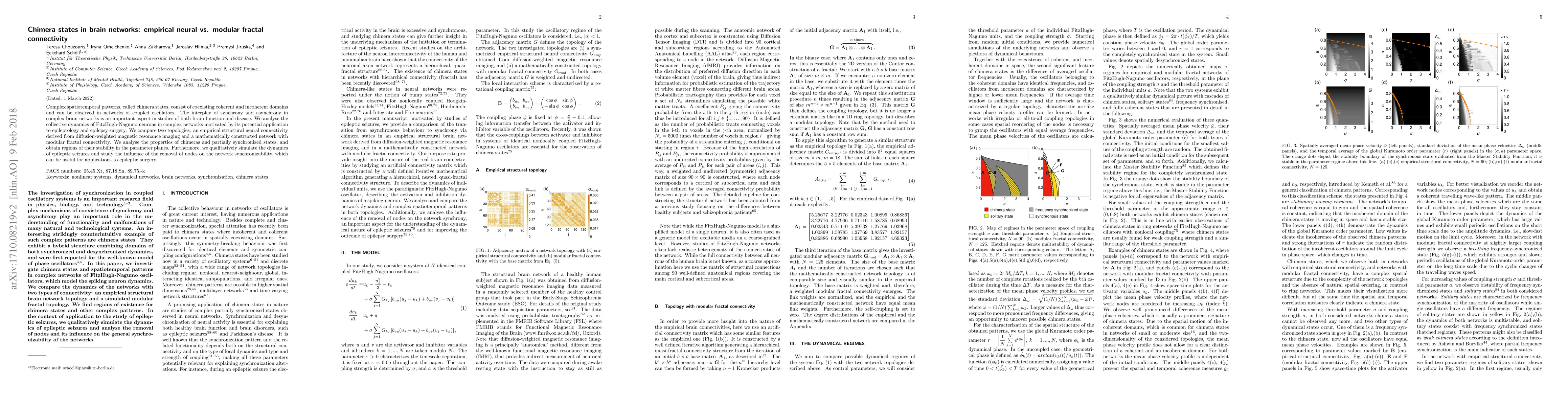 This paper investigates chimera states in brain networks, comparing empirical neural connectivity from MRI data to modular fractal connectivity. It analyzes the stability of coherent and incoherent domains in FitzHugh-Nagumo neuron models, with implications for understanding and treating epilepsy through surgical interventions.