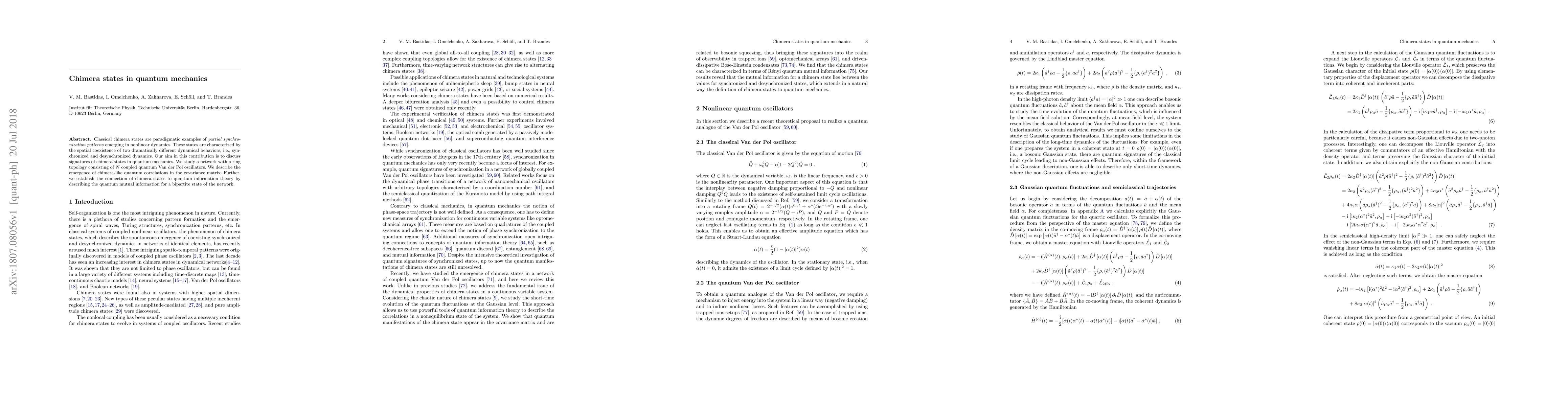 Classical chimera states are paradigmatic examples of partial synchronization patterns emerging in nonlinear dynamics. These states are characterized by the spatial coexistence of two dramatically different dynamical behaviors, i.e., synchronized and desynchronized dynamics. Our aim in this contribution is to discuss signatures of chimera states in quantum mechanics. We study a network with a ring topology consisting of N coupled quantum Van der Pol oscillators. We describe the emergence of chimera-like quantum correlations in the covariance matrix. Further, we establish the connection of chimera states to quantum information theory by describing the quantum mutual information for a bipartite state of the network.
