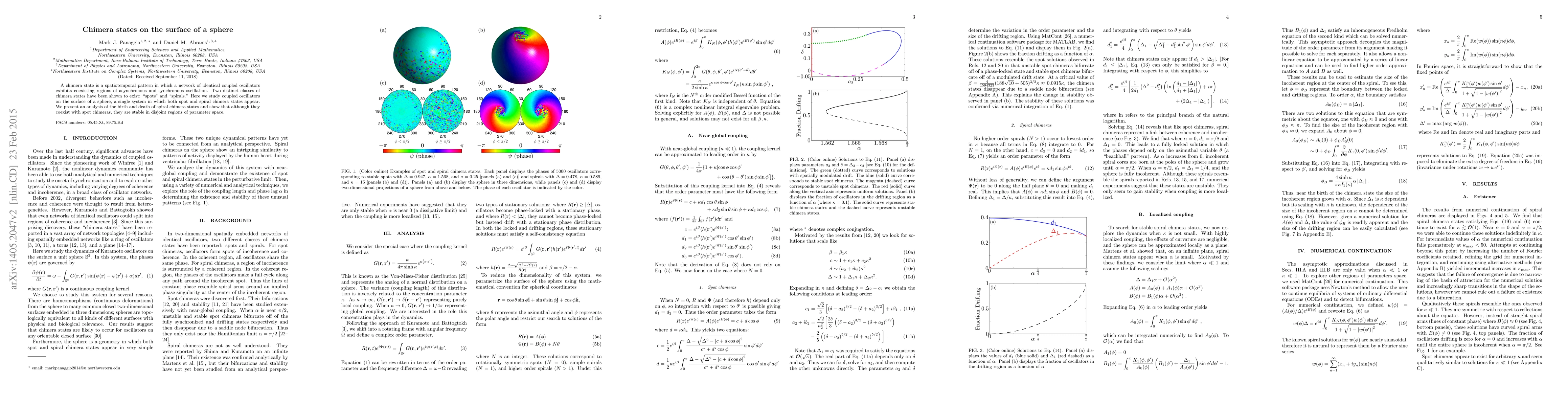 This paper investigates the emergence of chimera states on spherical networks of coupled oscillators, revealing both spot and spiral chimera patterns. It analyzes the stability and coexistence of spiral chimeras, demonstrating that they exist stably in separate regions of parameter space from spot chimeras.
