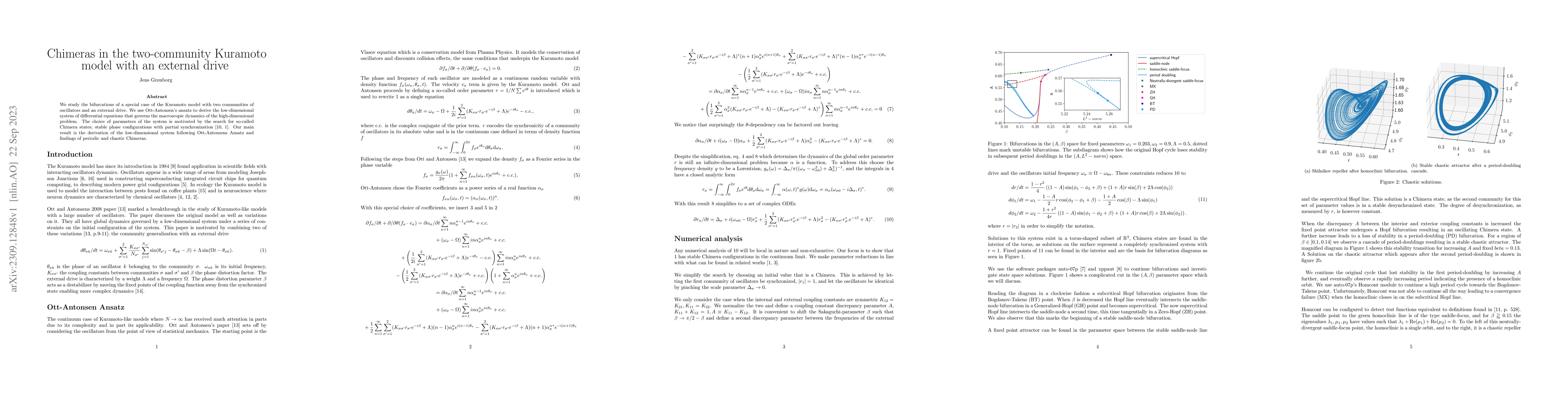 We study the bifurcations of a special case of the Kuramoto model with two communities of oscillators and an external drive. We use Ott-Antonsens ansatz to derive the low-dimensional system of differential equations that governs the macroscopic dynamics of the high-dimensional problem. The choice of parameters of the system is motivated by the search for so-called Chimera states; stable phase configurations with partial synchronization. Our main result is the derivation of the low-dimensional system following Ott-Antonsens Ansatz and findings of periodic and chaotic Chimeras.
