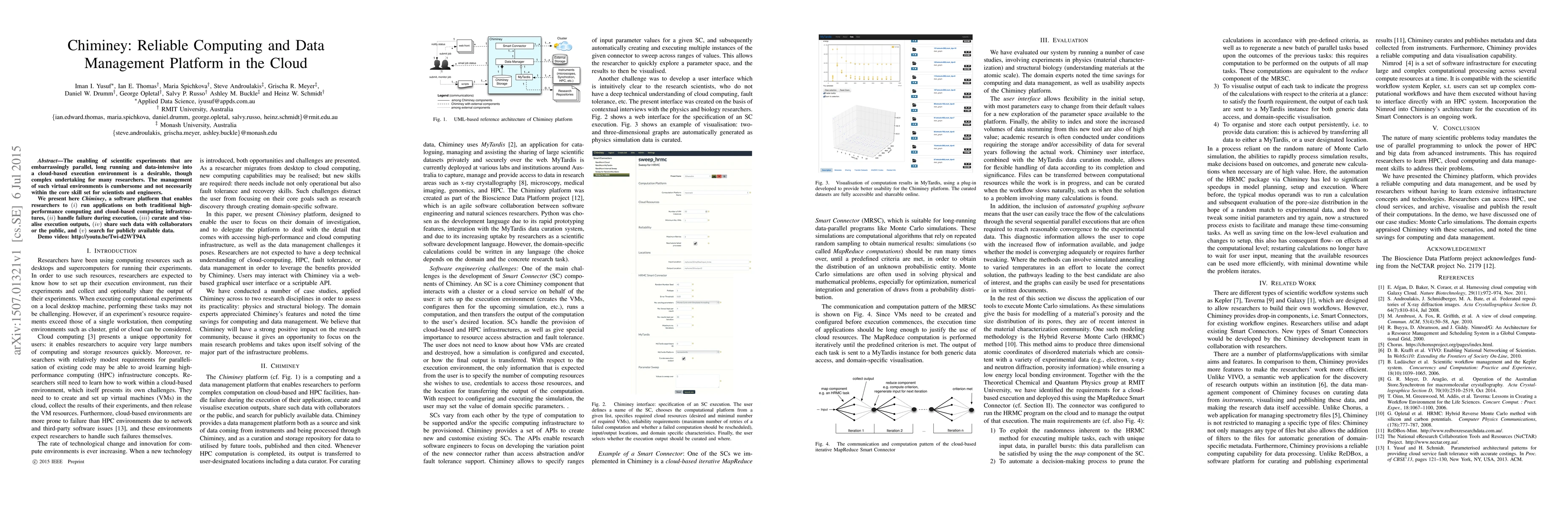 Chiminey is a software platform designed to facilitate the execution of parallel, cloud-based scientific experiments, offering features for failure handling, data curation, visualization, and collaborative sharing. It aims to simplify cloud management for researchers.