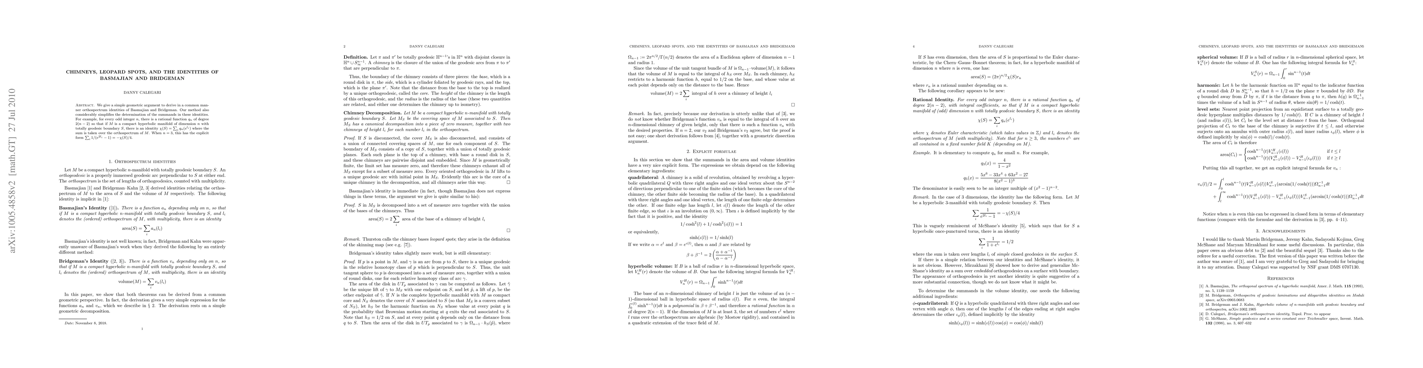 We give a simple geometric argument to derive in a common manner orthospectrum identities of Basmajian and Bridgeman. Our method also considerably simplifies the determination of the summands in these identities. For example, for every odd integer n, there is a rational function q_n of degree 2(n-2) so that if M is a compact hyperbolic manifold of dimension n with totally geodesic boundary S, there is an identity \chi(S) = \sum_i q_n(e^{l_i}) where the sum is taken over the orthospectrum of M. When n=3, this has the explicit form \sum_i 1/(e^{2l_i}-1) = -\chi(S)/4.
