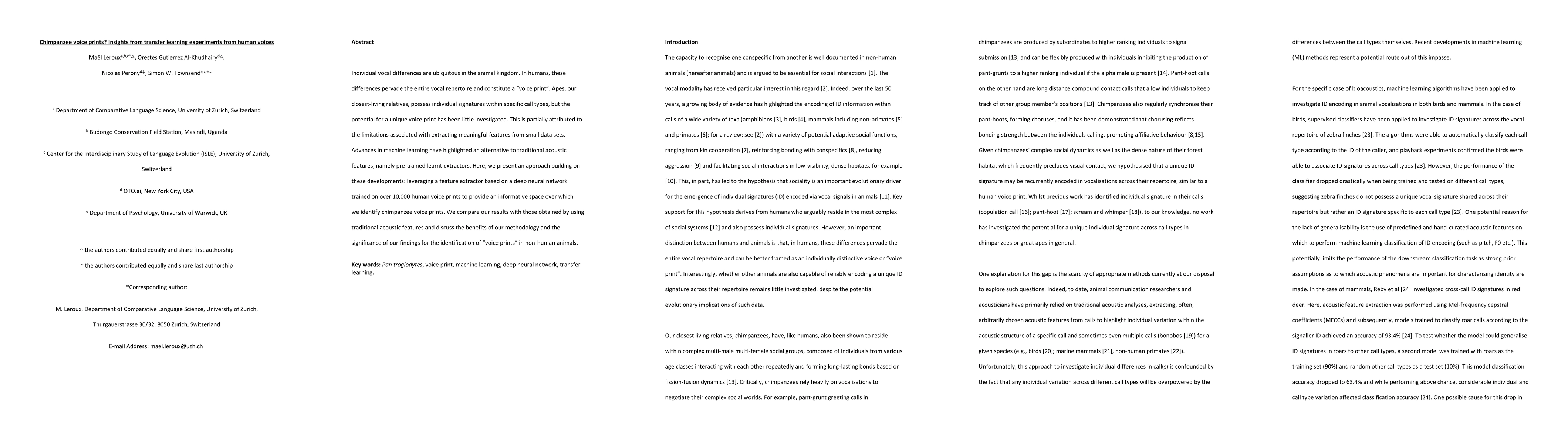 Individual vocal differences are ubiquitous in the animal kingdom. In humans, these differences pervade the entire vocal repertoire and constitute a "voice print". Apes, our closest-living relatives, possess individual signatures within specific call types, but the potential for a unique voice print has been little investigated. This is partially attributed to the limitations associated with extracting meaningful features from small data sets. Advances in machine learning have highlighted an alternative to traditional acoustic features, namely pre-trained learnt extractors. Here, we present an approach building on these developments: leveraging a feature extractor based on a deep neural network trained on over 10,000 human voice prints to provide an informative space over which we identify chimpanzee voice prints. We compare our results with those obtained by using traditional acoustic features and discuss the benefits of our methodology and the significance of our findings for the identification of "voice prints" in non-human animals.