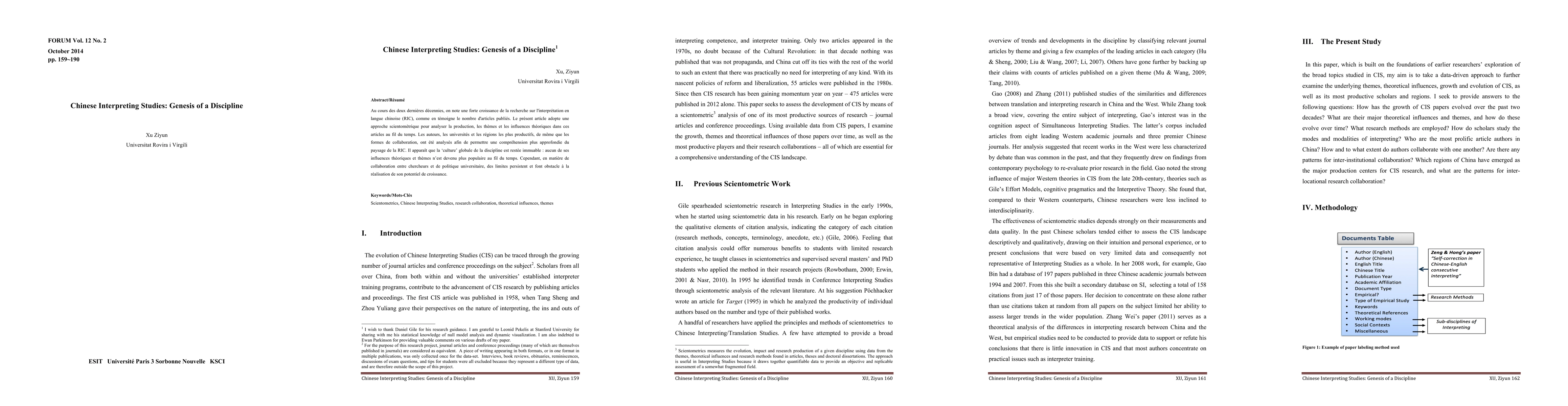 The growth of Chinese Interpreting Studies (CIS) has been robust over the past two decades; this is reflected in the total number of research papers produced. This paper takes a scientometric approach to assessing the production, themes and theoretical influences of those papers over time. The most productive authors, universities, and regions, as well as patterns of research collaboration, were analyzed to gain a deeper understanding of the CIS landscape. This study reveals that the general culture of the discipline remained constant throughout the period, none of its theoretical influences or topics having gained significantly in popularity. However, certain limitations in the way research is conducted (lack of collaboration, inadequate academic policies, etc.) hinder its potential for future growth.