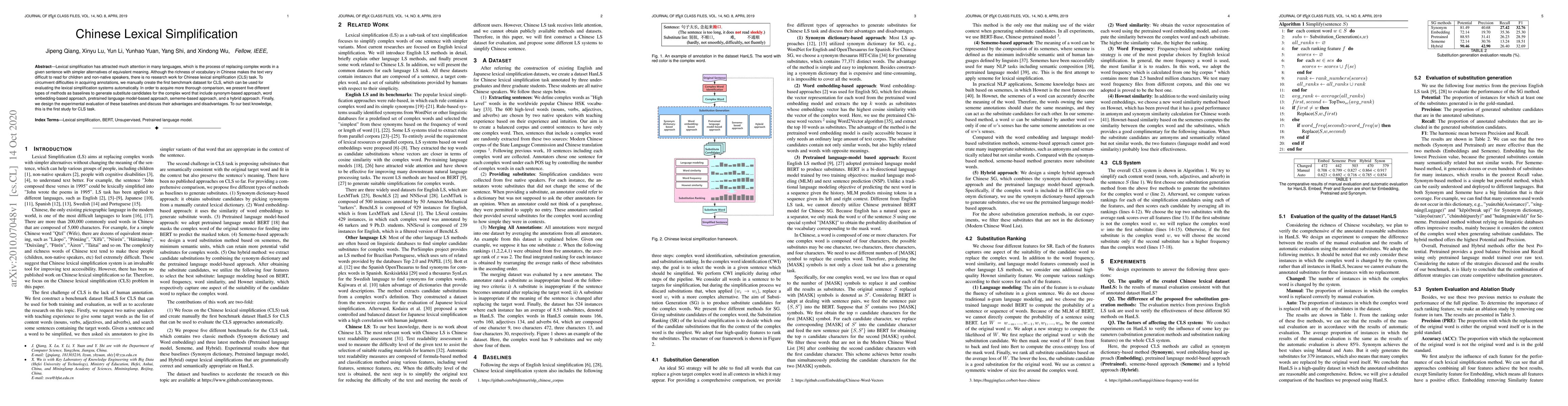 The paper presents the first benchmark dataset, HanLS, for Chinese lexical simplification (CLS) and proposes five baseline methods for generating substitute candidates for complex words, including synonym-based, word embedding-based, pretrained language model-based, sememe-based, and a hybrid approach.