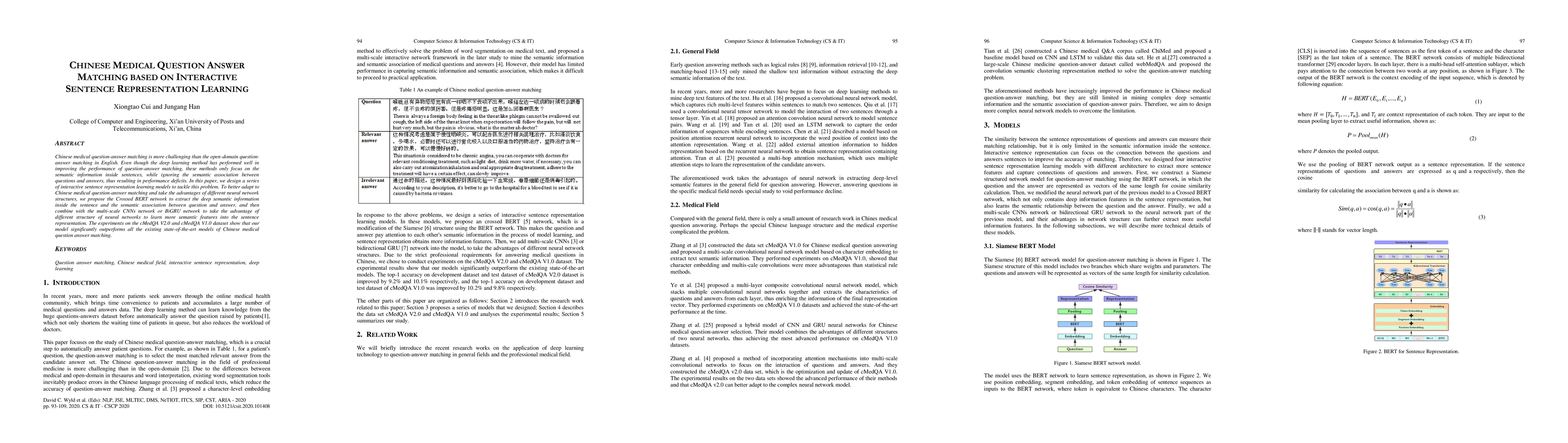 This paper proposes interactive sentence representation learning models to enhance Chinese medical question-answer matching, addressing the limitations of existing deep learning methods. The Crossed BERT network, combined with multi-scale CNNs or BiGRU, extracts deep semantic information and associations, achieving superior performance on cMedQA datasets.